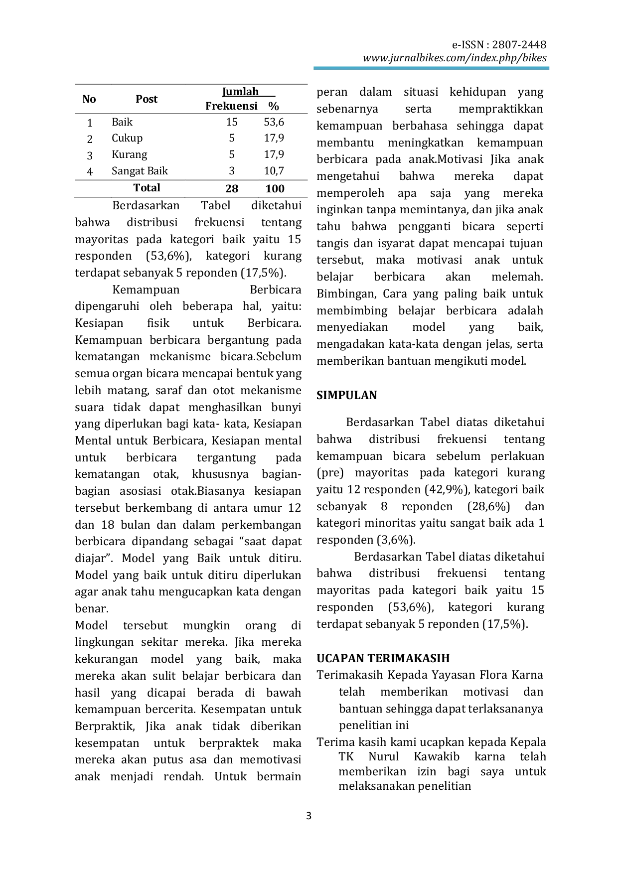 JURNAL KEBIDANAN, KEPERAWATAN DAN KESEHATAN (BIKES)JURNAL KEBIDANAN, KEPERAWATAN DAN KESEHATAN (BIKES)Kemampuan berbicara merupakan salah satu aspek perkembangan penting pada anak usia prasekolah. Penelitian ini bertujuan untuk mengetahui . Penelitian menggunakan desain quasi experiment dengan pendekatan pre-test dan post-test, serta teknik total sampling pada 28 anak usia 4–5 tahun. Hasil penelitian menunjukkan peningkatan kemampuan berbicara anak setelah intervensi, dari mayoritas kategori kurang menjadi baik dan sangat baik. Penggunaan buku cerita bergambar terbukti efektif dalam meningkatkan kemampuan berbicara anak prasekolah dan direkomendasikan sebagai media pembelajaran alternatif untuk stimulasi perkembangan bahasa.