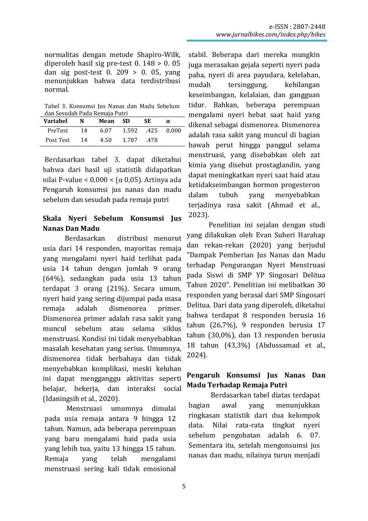 JURNAL KEBIDANAN, KEPERAWATAN DAN KESEHATAN (BIKES)JURNAL KEBIDANAN, KEPERAWATAN DAN KESEHATAN (BIKES)Prevalensi rasa sakit saat menstruasi di Indonesia mencapai 64,25%, terdiri dari 54,89% dismenore primer dan 69,36% dismenore sekunder. Di Provinsi Sumatera Utara, angka kejadian nyeri menstruasi ditemukan berkisar antara 30%-45% pada remaja. Penelitian ini bertujuan untuk menyelidiki pengaruh pemberian jus nanas dan madu terhadap dismenore pada remaja putri di Yayasan Perguruan Islam Cendekia, Kecamatan Medan Helvetia, tahun 2024. Penelitian ini menerapkan metode desain Quasi Eksperimen dengan pendekatan Satu Grup Pre Tes dan Post Tes. Subjek penelitian terdiri dari 14 siswi kelas VII di Yayasan Perguruan Islam Cendekia yang terletak di Kecamatan Medan Helvetia, Kota Medan. Teknik pengambilan sampel yang digunakan adalah total sampling dengan total 14 siswa. Untuk analisis data, digunakan analisis univariat, bivariat, dan multivariat. Salah satu terapi non-medis yang dapat digunakan untuk mengatasi dismenore adalah pemberian jus nanas dan madu. Hasil pembagian skala rasa sakit sebelum mengonsumsi jus nanas dan madu pada remaja perempuan menunjukkan bahwa ada 8 responden (57,1%) yang merasakan nyeri sedang, dan 6 responden (42,8%) mengalami nyeri berat yang terkontrol. Setelah mengonsumsi jus nanas dan madu, jumlah responden dengan nyeri ringan menjadi 6 orang (42,8%), sementara mereka yang merasakan nyeri sedang tetap 6 orang (42,8%). Uji Paired T-Test menunjukkan adanya pengaruh yang signifikan dari konsumsi jus nanas dan madu dengan nilai p-value yang sama dengan 0,000. Kesimpulan dari penelitian ini menunjukkan bahwa konsumsi jus nanas dan madu memiliki dampak terhadap dismenore pada remaja perempuan di Yayasan Perguruan Islam Cendekia Kota Medan tahun 2024.