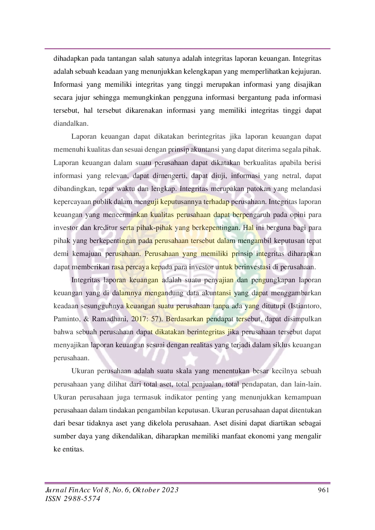 FIN-ACC (Finance Accounting)FIN-ACC (Finance Accounting)Setiap perusahaan membutuhkan informasi yang memadai agar kegiatan operasional perusahaan berjalan dengan baik. Manajemen perusahaan dapat menggunakan integritas laporan keuangan sebagai bentuk untuk memenuhi kebutuhan informasi perusahaan. Penelitian ini bertujuan untuk menganalisis pengaruh ukuran perusahaan, profitabilitas, dan kepemilikan institusional terhadap integritas laporan keuangan. Populasi dalam penelitian ini adalah 67 perusahaan sektor industri barang konsumsi di Bursa Efek Indonesia. Metode penarikan sampel adalah purposive sampling dengan kriteria perusahaan yang terdaftar periode 2016 hingga 2020 dan tidak mengalami suspensi selama periode penelitian sehingga diperoleh 35 perusahaan sebagai sampel. Bentuk penelitian asosiatif dengan metode penelitian hubungan kausal. Pengumpulan data menggunakan teknik studi dokumenter. Data di akses dari situs resmi BEI (www.idx.co.id). Teknik analisis data dilakukan dengan analisis statistik deskriptif, uji asumsi klasik, analisis regresi linear berganda, analisis koefisien korelasi berganda, koefisien determinasi, serta uji hipotesis. Hasil pengujian menunjukkan bahwa ukuran perusahaan berpengaruh negatif terhadap integritas laporan keuangan, profitabilitas berpengaruh positif terhadap integritas laporan keuangan, serta kepemilikan institusional tidak berpengaruh terhadap integritas laporan keuangan.