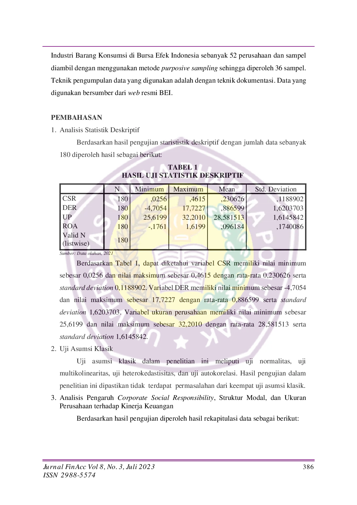 FIN-ACC (Finance Accounting)FIN-ACC (Finance Accounting)Penelitian ini bertujuan untuk menganalisis pengaruh corporate social responsibility, struktur modal, dan ukuran perusahaan terhadap kinerja keuangan. Objek penelitian pada 36 Perusahaan Sektor Industri Barang Konsumsi di Bursa Efek Indonesia. Penelitian ini menggunakan penelitian asosiatif dan dianalisis dengan model regresi OLS. Hasil penelitian menunjukkan bahwa corporate social responsibility tidak berpengaruh terhadap kinerja keuangan, sedangkan struktur modal dan ukuran perusahaan berpengaruh positif. Nilai Adjusted R2 sebesar 0,041, yang berarti variabel corporate social responsibility, struktur modal, dan ukuran perusahaan dapat menjelaskan perubahan kinerja keuangan sebesar 0,041 atau 4,1 persen, sedangkan sisanya dapat dijelaskan oleh variabel lain.