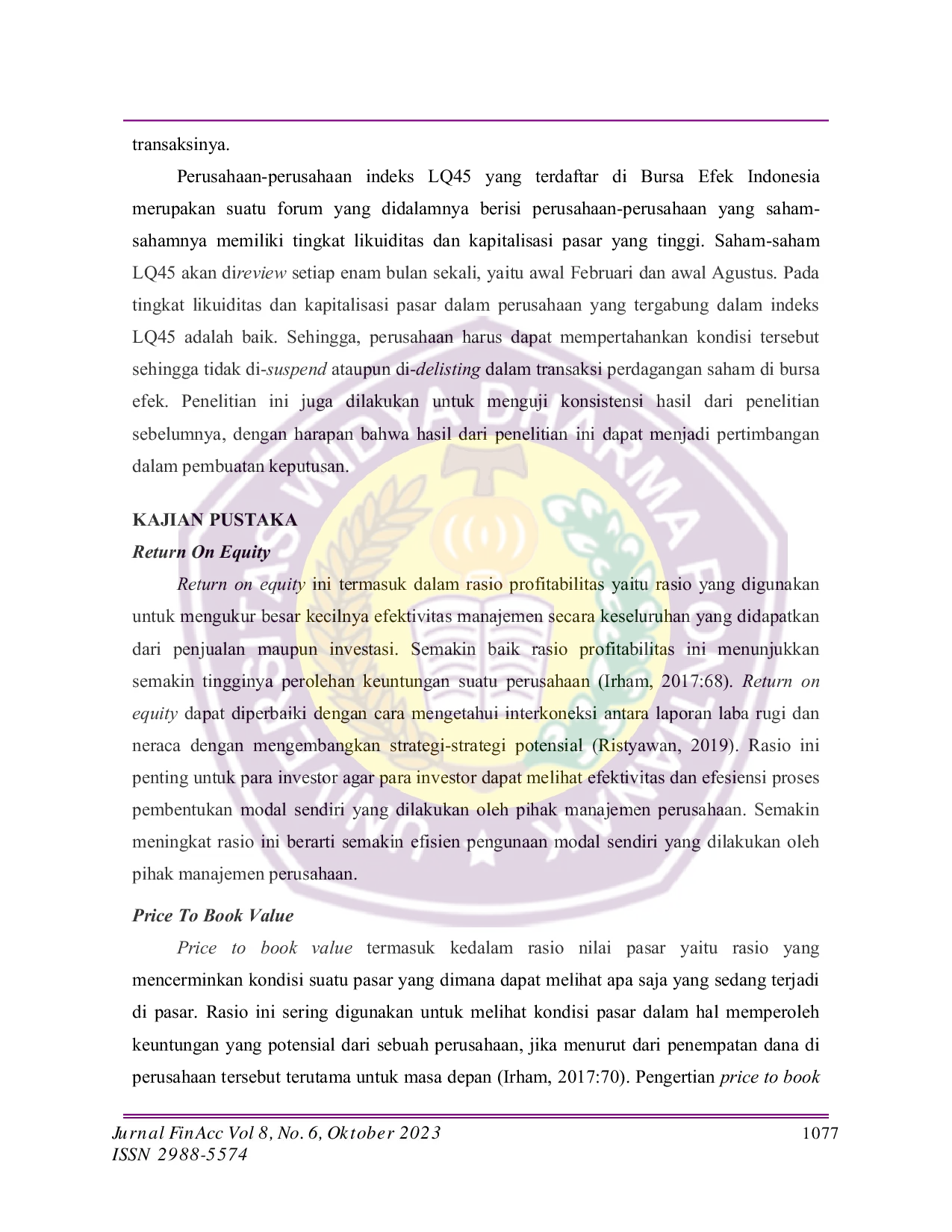 FIN-ACC (Finance Accounting)FIN-ACC (Finance Accounting)Penelitian ini bertujuan untuk mengetahui pengaruh return on equity, price to book value dan struktur modal terhadap return saham pada perusahaan yang tergabung dalam Indeks LQ45 yang terdaftar di Bursa Efek Indonesia dari tahun 2016 sampai dengan tahun 2020. Penelitian ini menggunakan bentuk penelitian asosiatif dengan metode penelitian kuantitatif. Teknik pengumpulan data adalah dokumentasi. Populasi pada penelitian ini adalah sebanyak 45 perusahaan menggunakan metode purpose sampling dengan dua kriteria yaitu perusahaan yang terdaftar di Indeks LQ45 periode berturut-turut dan perusahaan non perbankan, dari kriteria tersebut diperoleh sampel berjumlah 24 perusahaan. Teknik analisis data berupa analisis deskriptif, uji asumsi klasik, analisis linear berganda, analisis koefisien korelasi berganda dan koefisien determinasi, uji hipotesis yaitu uji F dan t. Hasil penelitian ini menunjukkan bahwa variabel return on equity, price to book value dan struktur modal berpengaruh terhadap return saham pada perusahaan yang tergabung dalam Indeks LQ45 yang terdaftar di Bursa Efek Indonesia.