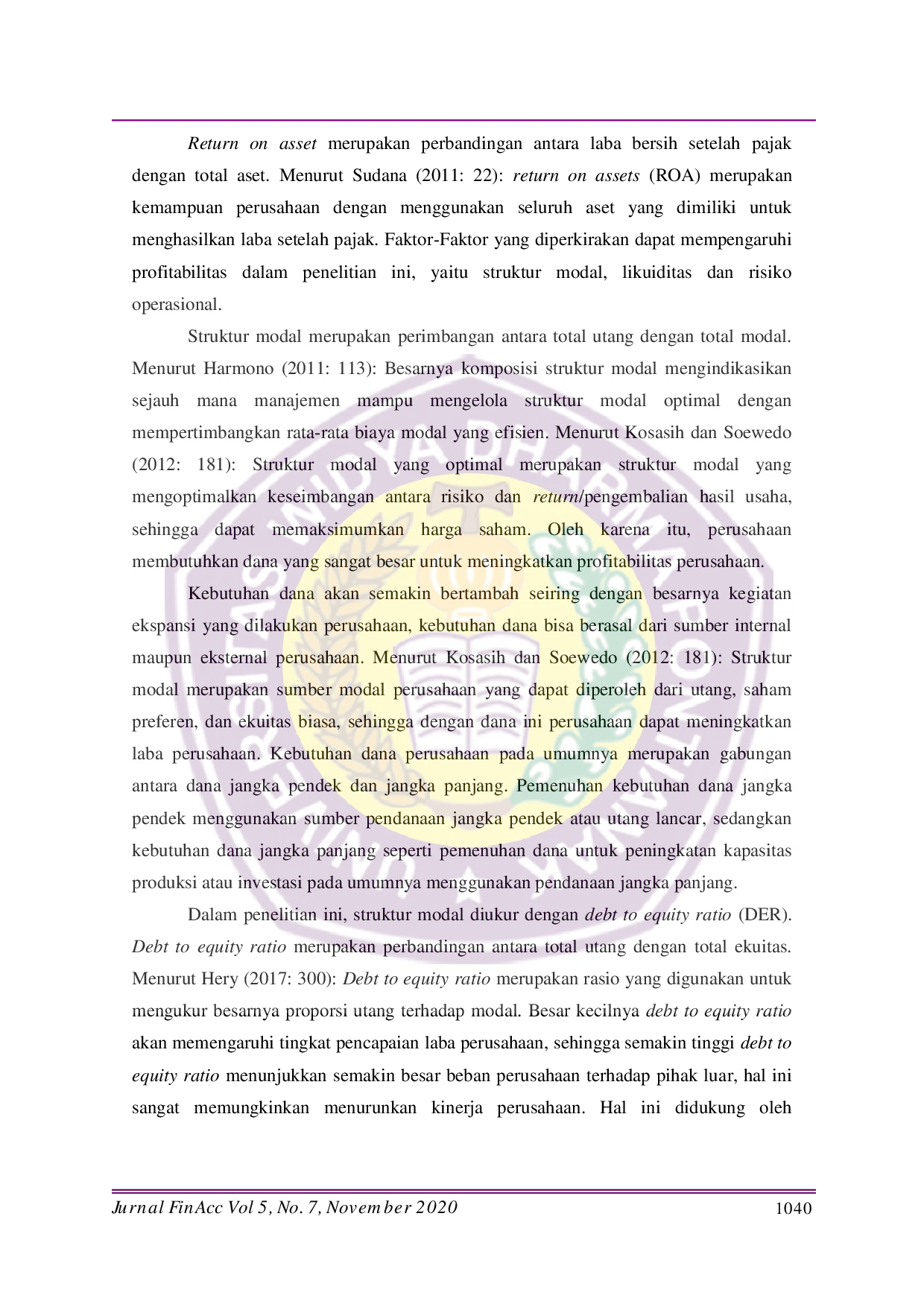 FIN-ACC (Finance Accounting)FIN-ACC (Finance Accounting)Tujuan penelitian ini adalah untuk mengetahui pengaruh Struktur Modal, Likuiditas dan Risiko Operasional terhadap Profitabilitas. Populasi sebanyak 44 perusahaan sektor industri barang konsumsi di Bursa Efek Indonesia dengan sampel sebanyak 33 perusahaan dengan penentuan menggunakan metode purposive sampling. Hasil pengujian menunjukkan struktur modal tidak berpengaruh terhadap profitabilitas dan risiko operasional berpengaruh negatif terhadap profitabilitas. Koefisien determinasi menunjukkan persentase dalam menjelaskan pengaruh struktur modal, likuiditas dan risiko operasional terhadap profitabilitas adalah sebesar 21,80 persen.