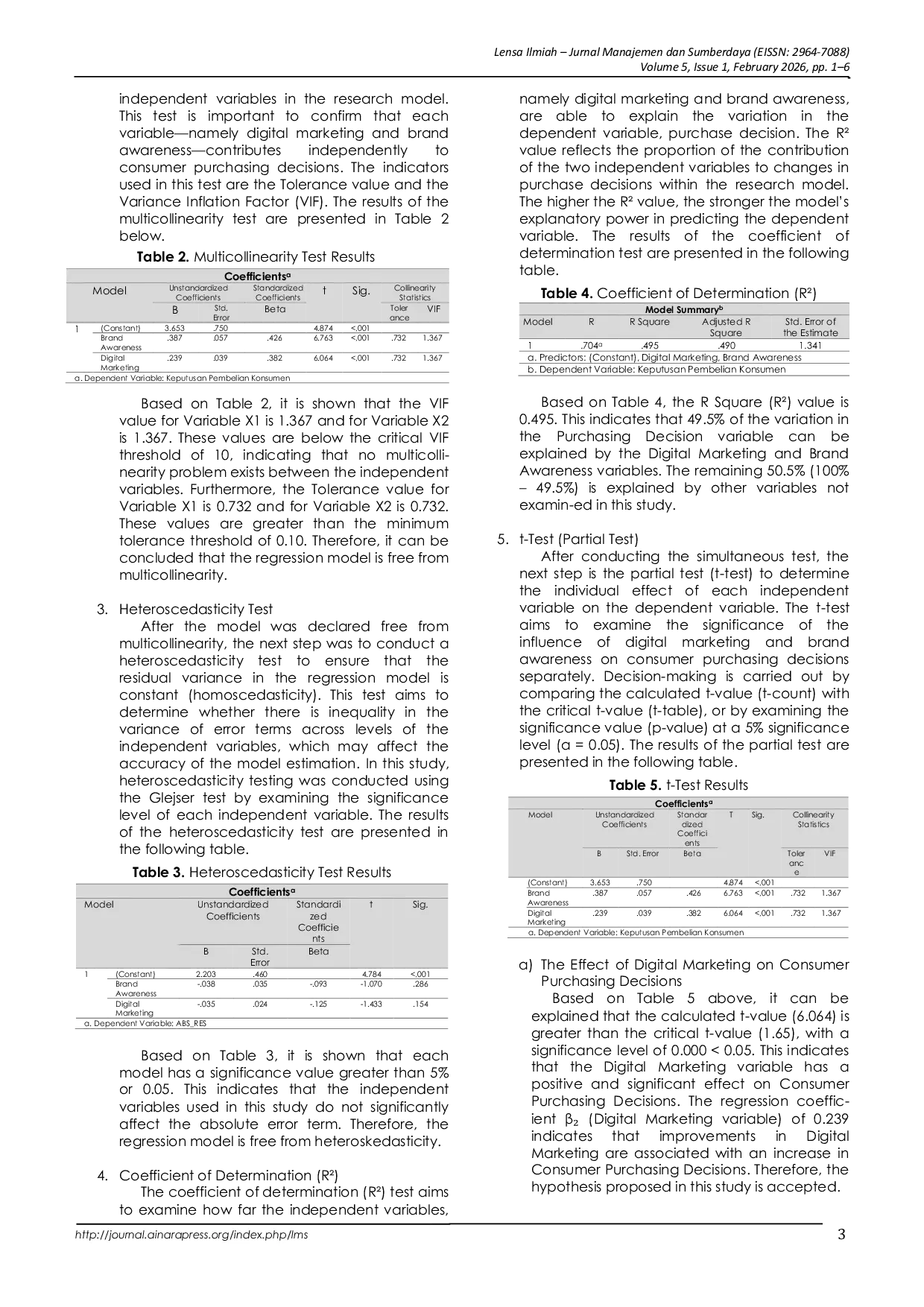 Lensa Ilmiah: Jurnal Manajemen dan SumberdayaLensa Ilmiah: Jurnal Manajemen dan SumberdayaThe rapid development of digital technology has transformed marketing practices, particularly in competitive sectors such as the food industry. However, prior studies report inconsistent findings regarding the influence of digital marketing and brand awareness on purchase decisions, highlighting the need for evidence in specific local contexts. This study examines the effects of digital marketing and brand awareness on consumer purchase decisions at PT Bali Food Industry, a frozen fruit producer in Bali. A quantitative approach was employed using purposive sampling, resulting in 176 valid respondents who had seen the companys advertisements and purchased its products. Data were collected through an online questionnaire using a five-point Likert scale and analyzed using multiple linear regression with SPSS, following reliability and classical assumption tests. The results indicate that digital marketing positively and significantly affects purchase decisions (B = 0.239; β = 0.382; t = 6.064; p < 0.001) and that brand awareness also has a positive and significant effect (B = 0.387; β = 0.426; t = 6.763; p < 0.001). Simultaneously, both variables significantly influence purchase decisions (F = 85.418; p < 0.001), explaining 49.5% of the variance (R² = 0.495). These findings suggest that optimizing digital marketing and strengthening brand awareness can meaningfully enhance consumer purchase decisions.