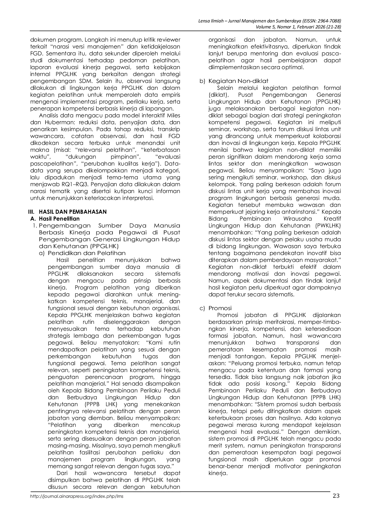 Lensa Ilmiah: Jurnal Manajemen dan SumberdayaLensa Ilmiah: Jurnal Manajemen dan SumberdayaPenelitian ini bertujuan untuk memetakan bentuk pelaksanaan pengembangan SDM berbasis kinerja, mengidentifikasi faktor pendorong–penghambatnya, dan menjelaskan bagaimana kontribusi program tersebut muncul pada kinerja pegawai di Pusat Pengembangan Generasi Lingkungan Hidup dan Kehutanan (PPGLHK). Pendekatan yang digunakan adalah kualitatif deskriptif dengan teknik purposive sampling pada empat informan kunci (Kepala Pusat, dua Kepala Bidang, dan Kepala Subbagian Tata Usaha). Data dikumpulkan melalui wawancara mendalam, observasi, FGD, dan studi dokumentasi, lalu dianalisis menggunakan model interaktif Miles dan Huberman (reduksi, penyajian, penarikan kesimpulan). Temuan menunjukkan bahwa pengembangan SDM telah diarahkan untuk mendukung target kinerja serta organisasi melalui pelatihan yang memperkuat kompetensi pembentukan sikap kerja profesional. Namun, efektivitas program masih dibatasi oleh keterbatasan waktu, ketidaksesuaian sebagian materi pelatihan dengan kebutuhan kerja, dan evaluasi pascapelatihan yang belum kuat, sehingga integrasi program pengembangan SDM dan strategi peningkatan kinerja organisasi belum optimal. Kontribusi positif pengembangan SDM pada kinerja muncul terutama pada kualitas kerja, kuantitas penyelesaian tugas, dan keandalan pelaksanaan pekerjaan, yang tampak konsisten pada tema-tema hasil wawancara/observasi serta didukung dokumen internal terkait kinerja. Penguatan koordinasi lintas unit dan evaluasi berbasis bukti direkomendasikan agar pengembangan SDM semakin selaras dengan prioritas kinerja organisasi.