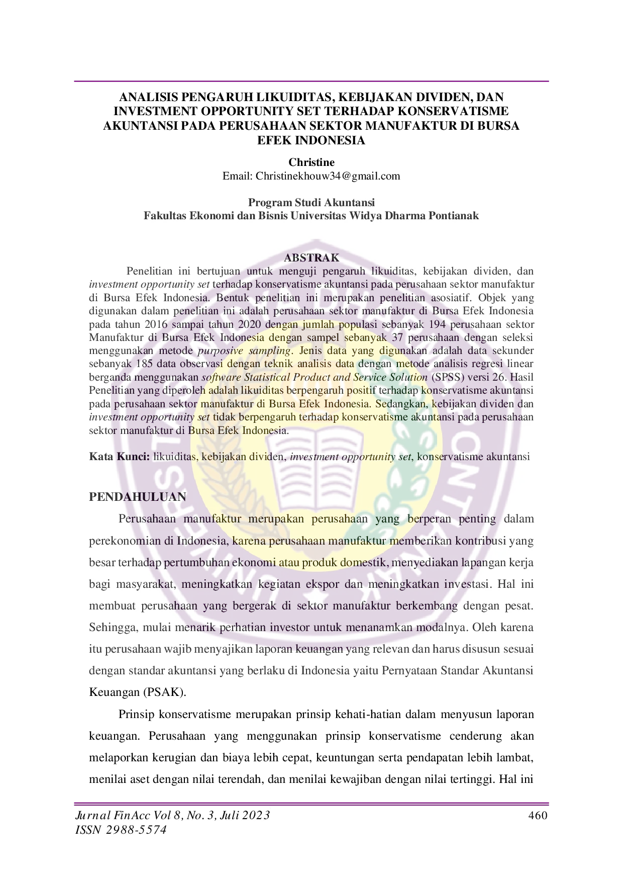 FIN-ACC (Finance Accounting)FIN-ACC (Finance Accounting)Penelitian ini bertujuan untuk menguji pengaruh likuiditas, kebijakan dividen, dan investment opportunity set terhadap konservatisme akuntansi pada perusahaan sektor manufaktur di Bursa Efek Indonesia. Objek penelitian ini adalah perusahaan sektor manufaktur di Bursa Efek Indonesia pada tahun 2016 sampai tahun 2020 dengan jumlah populasi sebanyak 194 perusahaan sektor manufaktur. Jenis data yang digunakan adalah data sekunder dengan teknik analisis data menggunakan metode analisis regresi linear berganda. Hasil penelitian menunjukkan bahwa likuiditas berpengaruh positif terhadap konservatisme akuntansi pada perusahaan sektor manufaktur di Bursa Efek Indonesia, sedangkan kebijakan dividen dan investment opportunity set tidak berpengaruh terhadap konservatisme akuntansi.