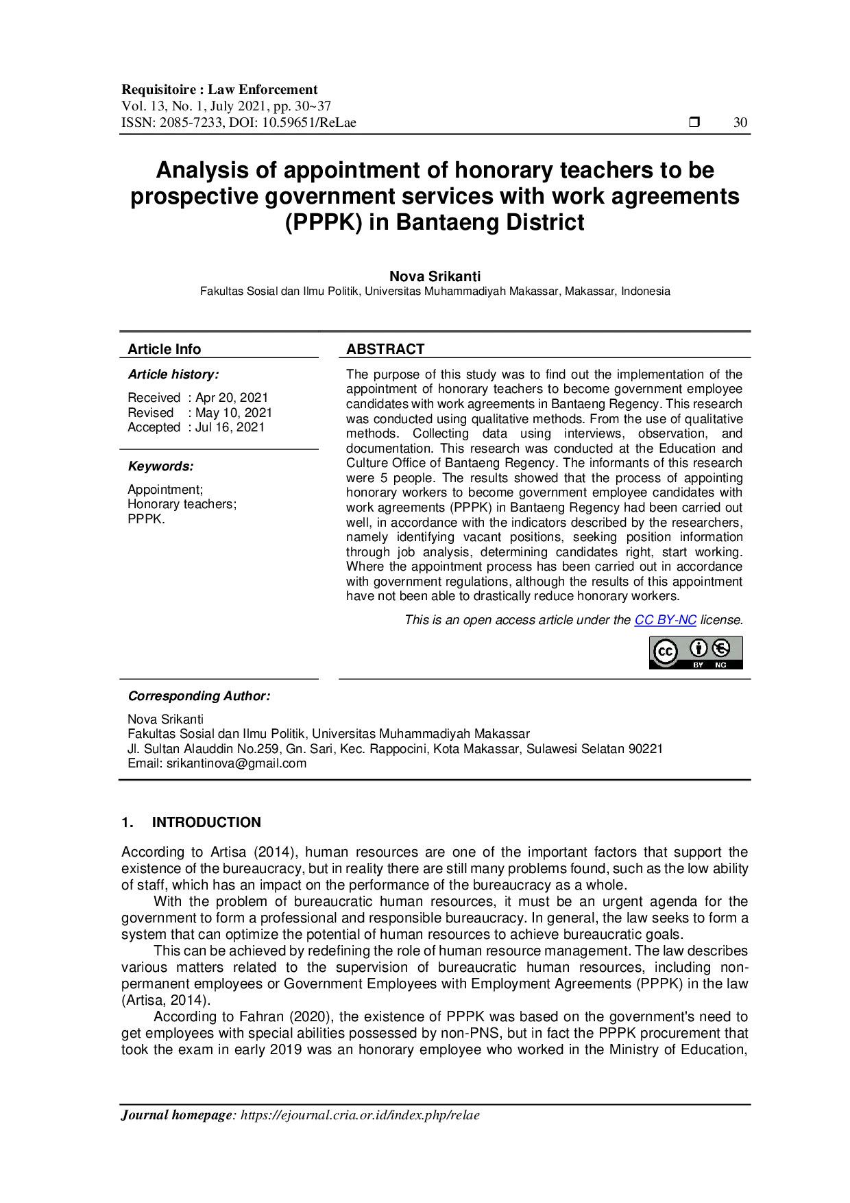 Requisitoire Law EnforcementRequisitoire Law EnforcementPenelitian ini bertujuan untuk mengetahui implementasi pengangkatan guru honor menjadi calon pegawai pemerintah dengan perjanjian kerja di Kabupaten Bantaeng. Penelitian ini menggunakan metode kualitatif. Pengumpulan data menggunakan wawancara, observasi, dan dokumentasi. Penelitian ini dilakukan di Kantor Pendidikan dan Kebudayaan Kabupaten Bantaeng. Informan penelitian ini adalah 5 orang. Hasil penelitian menunjukkan bahwa proses pengangkatan tenaga kerja honor menjadi calon pegawai pemerintah dengan perjanjian kerja (PPPK) di Kabupaten Bantaeng telah dilaksanakan dengan baik, sesuai dengan indikator yang digambarkan oleh peneliti, yaitu mengidentifikasi posisi yang kosong, mencari informasi posisi melalui analisis jabatan, menentukan kandidat yang tepat, memulai bekerja. Di mana proses pengangkatan telah dilaksanakan sesuai dengan peraturan pemerintah, meskipun hasil pengangkatan ini belum dapat secara drastis mengurangi tenaga honorer.