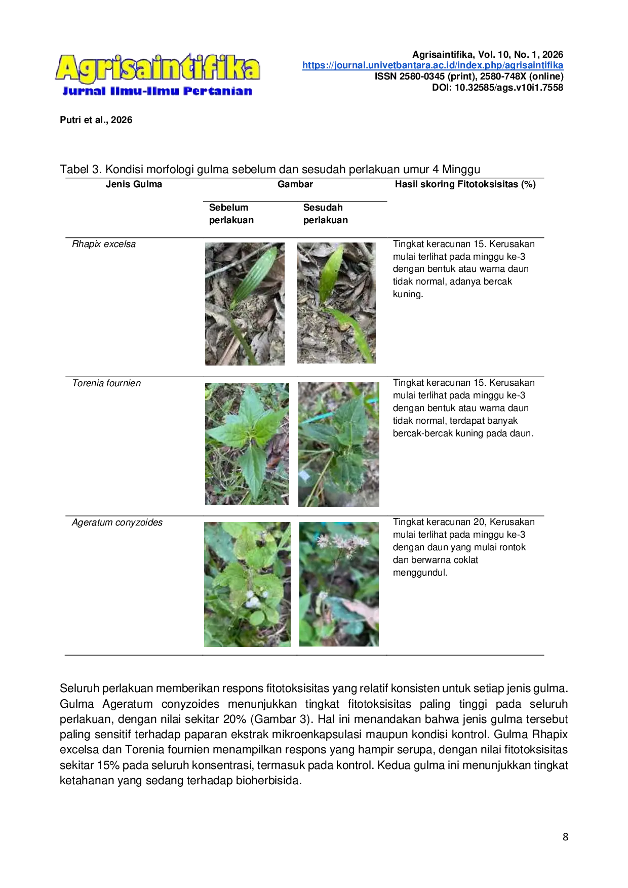 Agrisaintifika: Jurnal Ilmu-Ilmu PertanianAgrisaintifika: Jurnal Ilmu-Ilmu PertanianPenelitian ini dilakukan untuk mengkaji sifat mikroenkapsulasi ekstrak umbi Dioscorea hispida Dennts. yang diproses menggunakan metode thin layer drying serta menilai kemampuan hasil mikroenkapsulasi tersebut sebagai bioherbisida terhadap gulma berdaun lebar. Ekstrak disiapkan dalam tiga tingkat konsentrasi, yaitu 20%, 30%, dan 40% dengan 3 kali ulangan, kemudian masing-masing ekstrak dicampur dengan maltodekstrin dan tween 80 sebagai bahan penyalut sebelum melalui tahap pengeringan untuk menghasilkan serbuk mikrokapsulasi. Hasil analisis menunjukkan bahwa mikrokapsulasi memiliki bentuk bulat, stabil, dan mampu mencapai efisiensi yang tinggi. Pengamatan menggunakan SEM mengungkapkan adanya dua lapisan yang menandakan bahwa senyawa aktif terperangkap dengan baik di dalam matriks penyalut. Metode uji toksisitas (%) dilakukan dengan mengamati secara visual dengan penggunaan metode skoring. Uji fitotoksisitas terhadap gulma Ageratum conyzoides menunjukkan adanya gejala keracunan paling tinggi pada konsentrasi 40% dengan skoring 20% yang terlihat mengalami klorosis, kerontokan daun, serta gangguan fisiologis. Ageratum conyzoides menunjukkan tingkat fitotoksisitas sebesar 20%. Secara keseluruhan, hasil ini menegaskan bahwa mikroenkapsulasi ekstrak Dioscorea hispida Dennts. berpotensi besar digunakan sebagai bioherbisida alami untuk menekan pertumbuhan gulma berdaun lebar.