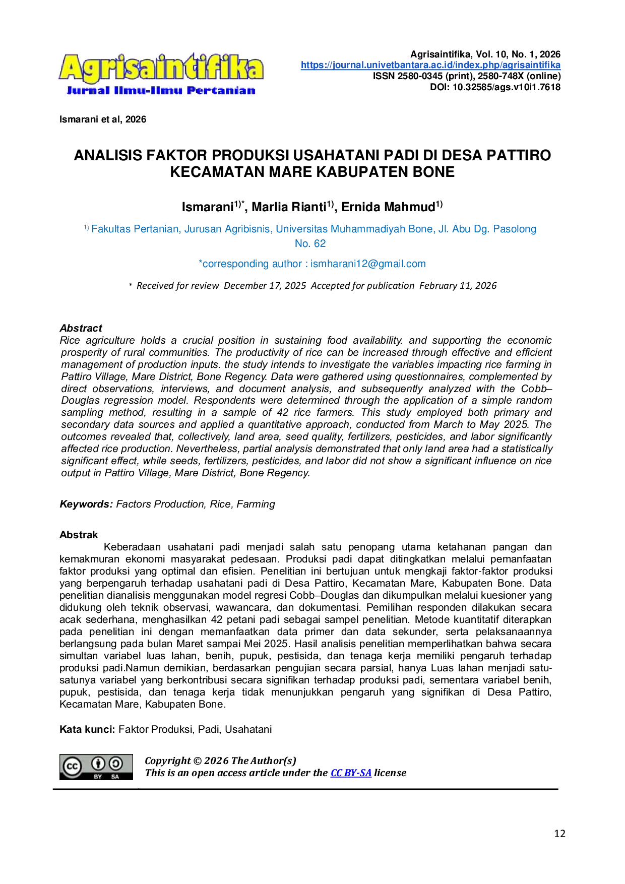 Agrisaintifika: Jurnal Ilmu-Ilmu PertanianAgrisaintifika: Jurnal Ilmu-Ilmu PertanianKeberadaan usahatani padi menjadi salah satu penopang utama ketahanan pangan dan kemakmuran ekonomi masyarakat pedesaan. Produksi padi dapat ditingkatkan melalui pemanfaatan faktor produksi yang optimal dan efisien. Penelitian ini bertujuan untuk mengkaji faktor-faktor produksi yang berpengaruh terhadap usahatani padi di Desa Pattiro, Kecamatan Mare, Kabupaten Bone. Data penelitian dianalisis menggunakan model regresi Cobb–Douglas dan dikumpulkan melalui kuesioner yang didukung oleh teknik observasi, wawancara, dan dokumentasi. Pemilihan responden dilakukan secara acak sederhana, menghasilkan 42 petani padi sebagai sampel penelitian. Metode kuantitatif diterapkan pada penelitian ini dengan memanfaatkan data primer dan data sekunder, serta pelaksanaannya berlangsung pada bulan Maret sampai Mei 2025. Hasil analisis penelitian memperlihatkan bahwa secara simultan variabel luas lahan, benih, pupuk, pestisida, dan tenaga kerja memiliki pengaruh terhadap produksi padi. Namun demikian, berdasarkan pengujian secara parsial, hanya luas lahan menjadi satu-satunya variabel yang berkontribusi secara signifikan terhadap produksi padi, sementara variabel benih, pupuk, pestisida, dan tenaga kerja tidak menunjukkan pengaruh yang signifikan di Desa Pattiro, Kecamatan Mare, Kabupaten Bone.