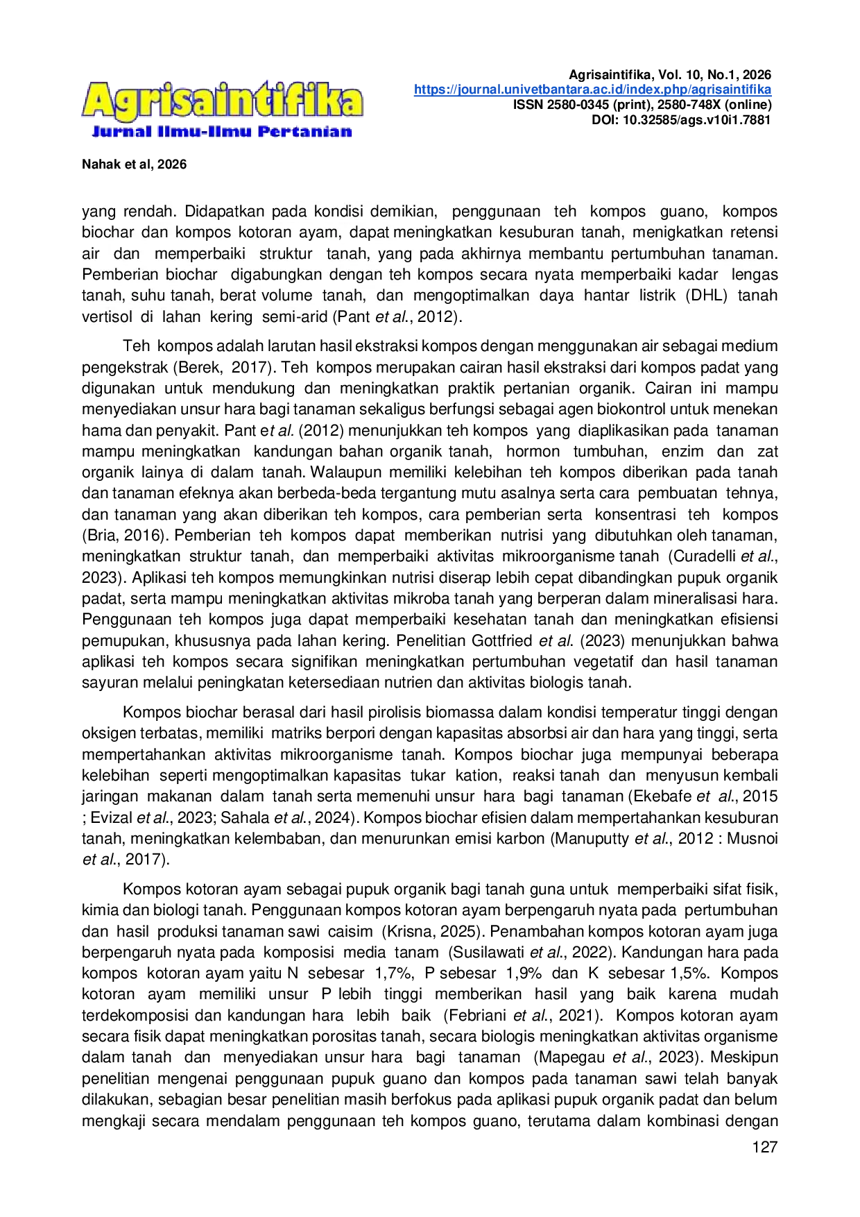 Agrisaintifika: Jurnal Ilmu-Ilmu PertanianAgrisaintifika: Jurnal Ilmu-Ilmu PertanianPenelitian ini dilaksanakan pada bulan September-November 2025 di Greenhouse dan dilanjutkan di Laboratorium Fakultas Pertanian, Sains dan Kesehatan Universitas Timor. Permasalahan utama lahan kering meliputi kekurangan air, tanah bersifat asam, kekurangan unsur hara, kapasitas tukar kation rendah, dan solum tanah dangkal. Penelitian bertujuan mengkaji pengaruh pemberian teh kompos guano dan jenis kompos terhadap pertumbuhan dan hasil sawi caisim di lahan kering. Analisis data menggunakan program SAS 9.1. Temuan menunjukkan bahwa interaksi antara teh kompos guano dan jenis kompos berpengaruh signifikan pada tinggi tanaman pada umur 7 HST, jumlah daun pada umur 14 dan 21 HST, dan berat segar total tanaman. Perlakuan tunggal teh kompos guano berpengaruh signifikan pada tinggi tanaman pada umur 21 dan 28 HST, berat segar tajuk, berat segar akar, panjang akar, dan berat kering akar dengan dosis optimal 300 ml teh kompos guano. Perlakuan tunggal jenis kompos berpengaruh signifikan pada seluruh parameter pertumbuhan vegetatif dan hasil, dengan perlakuan terbaik K1: 1,5 kg tanah 1,5 kg kompos biochar.