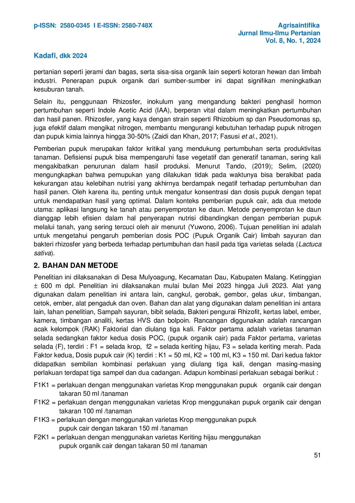 Agrisaintifika: Jurnal Ilmu-Ilmu PertanianAgrisaintifika: Jurnal Ilmu-Ilmu PertanianPenelitian ini bertujuan untuk mengetahui pengaruh pemberian dosis POC limbah sayuran dengan bakteri rhizofit terhadap tiga varietas tanaman selada. Penelitian ini dilaksanakan di Desa Mulyoagung, Kecamatan Dau, Kabupaten Malang. Ketinggian ± 600 m dpl. Penelitian dilaksanakan pada bulan Mei – Juli 2023. Rancangan diggunakan adalah Rancangan Acak Kelompok (RAK) Faktorial, dengan tiga kali ulangan. Faktor pertama adalah varietas tanaman selada sedangkan faktor kedua dosis POC, (pupuk organik cair) pada Faktor pertama, varietas selada (F), terdiri : F1 = selada krop, f2 = selada keriting hijau, F3 = selada keriting merah. Pada Faktor kedua, Dosis pupuk cair (K) terdiri : K1 = 50 ml, K2 = 100 ml, K3 = 150 ml. Variebel yang diamati adalah jumlah daun, luas daun, berat segar brangkasan, berat kering brangkasan, berat basah akar dan berat kering akar tanaman selada. Hasil kesimpulan dari penelitian ini adalah pada umur 14, 21, dan 28 hari setelah tanam (HST), terdapat interaksi signifikan pada jumlah daun dengan kombinasi terbaik diperoleh pada varietas selada butter menggunakan 50 ml pupuk organik cair (POC). Varietas krop menunjukkan kinerja yang lebih unggul dalam pertumbuhan dibandingkan dengan varietas selada keriting hijau dan selada merah. Pemberian POC sebanyak 50 ml secara signifikan mempengaruhi jumlah daun di umur 14, 21, dan 28 HST, area daun pada 21 HST, serta berat basah dan kering bagian atas tanaman. Namun, pemberian ini tidak menunjukkan pengaruh signifikan terhadap berat basah dan kering akar.