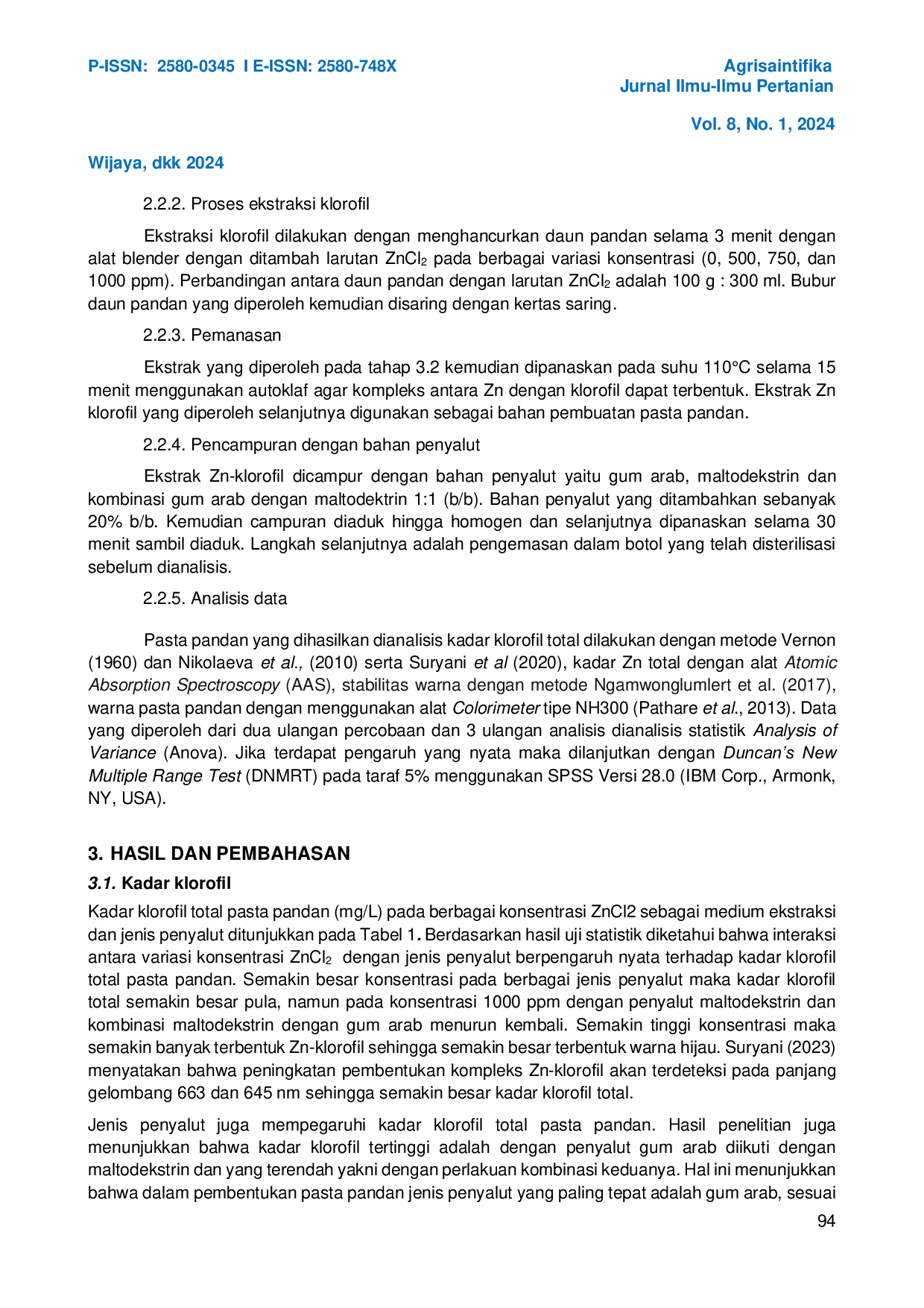 Agrisaintifika: Jurnal Ilmu-Ilmu PertanianAgrisaintifika: Jurnal Ilmu-Ilmu PertanianPewarna makanan adalah bahan tambahan pangan yang ketika ditambahkan atau diaplikasikan pada pangan mampu memberi atau memperbaiki warna. Selain memiliki aroma yang khas, pandan juga dapat dimanfaatkan sebagai pewarna alami. Namun, pewarna makanan alami memiliki stabilitas warna yang kurang baik karena sifat pigmennya yang mudah terdegradasi sehingga tidak optimal dalam memberikan warna pada produk pangan. Dengan demikian diperlukan suatu produk pasta pandan yang memiliki kestabilan baik. Pembentukan kompleks Zn-klorofil diketahui dapat menjaga kestabilan warna. Penelitian ini bertujuan untuk mempelajari pengaruh ZnCl2 sebagai media ekstraksi; gum arab dan maltodekstrin sebagai bahan pengisi pada pembuatan pasta pandan. Hasil penelitian menunjukkan bahwa penambahan konsentrasi ZnCl2 dan penggunaan variasi bahan pengisi berpengaruh secara nyata terhadap kadar klorofil, kadar Zn total, serta uji warna pada sampel pasta pandan yang dihasilkan. Sampel terbaik diketahui sampel dengan perlakuan penambahan konsentrasi ZnCl2 1000 ppm dan penggunaan bahan pengisi berupa gum arab 20% (2:0) yang memiliki kadar klorofil sebesar 237,27 mg/g klorofil, dan kadar Zn total sebesar 173,19 mg/g. Dari hasil penelitian menunjukkan bahwa penggunaan ZnCl2 1000 ppm dan bahan pengisi berupa gum arab dapat menghasilkan pasta pandan dengan kualitas yang baik.