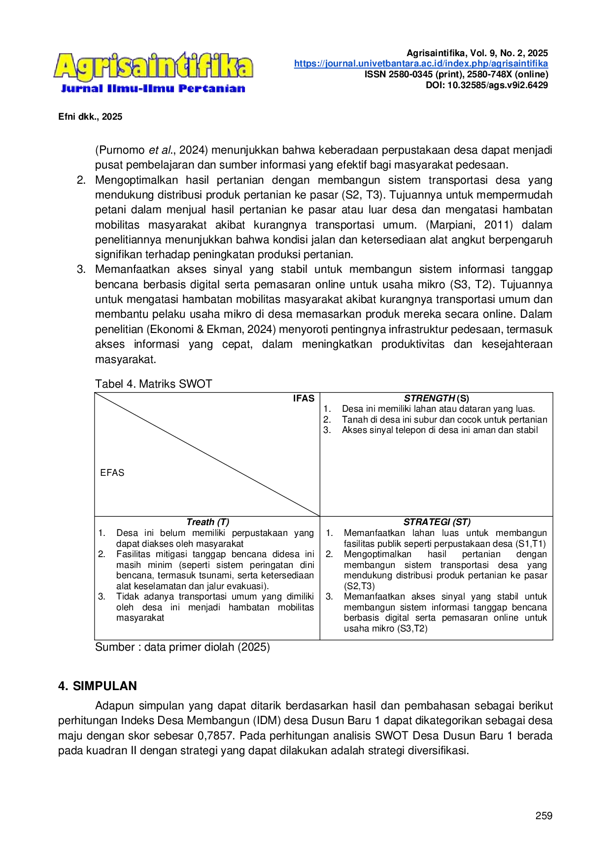 Agrisaintifika: Jurnal Ilmu-Ilmu PertanianAgrisaintifika: Jurnal Ilmu-Ilmu PertanianDesa Dusun Baru I, yang terletak di Kecamatan Pondok Kubang Kabupaten Bengkulu Tengah, menghadapi beberapa tantangan dalam perkembangannya. Penelitian ini bertujuan untuk merumuskan strategi pengembangan potensi Desa Dusun Baru I berbasis Indeks Desa Membangun (IDM) serta menentukan posisi desa dalam kuadran analisis SWOT berdasarkan faktor internal dan eksternal. Desa Dusun Baru I menghadapi keterbatasan akses permodalan, serta rendahnya pemanfaatan potensi lokal. Metode penelitian ini menggunakan metode deskriptif kualitatif, yang bertujuan untuk menganalisis objek, kondisi, kelompok manusia, atau fenomena lainnya dalam keadaan alami tanpa adanya intervensi eksperimen dengan teknik pengumpulan data melalui wawancara, dokumentasi, dan kuesioner. Hasil analisis IDM menunjukkan bahwa Desa Dusun Baru I memiliki skor 0,7857, sehingga dikategorikan sebagai desa maju. IDM terdiri dari tiga indeks, pada penelitian ini indeks ketahanan lingkungan memiliki skor tertinggi, Ini berarti Desa Dusun Baru I telah memiliki sistem pengelolaan lingkungan yang baik dan minimnya risiko bencana lingkungan yang dapat menghambat pembangunan desa. Selanjutnya, indeks ketahanan sosial mendapatkan yang menunjukkan bahwa aspek sosial di desa ini sudah cukup kuat. Hal ini mencerminkan tingginya tingkat pendidikan, kesehatan yang memadai, serta keberagaman budaya dan sosial yang terjaga, sehingga menciptakan kondisi sosial yang stabil dan mendukung pembangunan desa. Namun, pada indeks ketahanan ekonomi menunjukkan bahwa aspek ekonomi desa masih menjadi tantangan utama. Dalam analisis SWOT menempatkan desa ini pada kuadran II, yang menunjukkan perlunya strategi diversifikasi untuk menghadapi ancaman eksternal yang lebih besar dibandingkan peluang yang tersedia. Alternatif strategi yang diusulkan meliputi pemanfaatan lahan untuk fasilitas publik, penguatan sistem transportasi desa guna mendukung distribusi hasil pertanian, serta optimalisasi teknologi digital untuk pemasaran usaha mikro dan sistem informasi tanggap bencana.