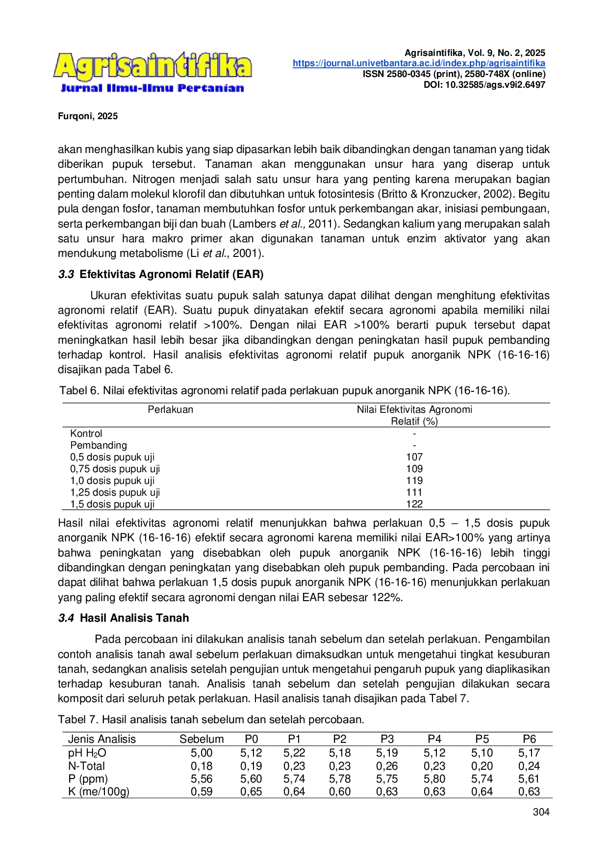 Agrisaintifika: Jurnal Ilmu-Ilmu PertanianAgrisaintifika: Jurnal Ilmu-Ilmu PertanianTanaman dapat memanfaatkan nutrisi dengan efisien berkat interaksi dengan berbagai faktor lingkungan. Pemberian unsur hara makro yang berimbang sangat diperlukan guna menunjang pertumbuhan tanaman dengan optimal. Percobaan ini bertujuan untuk mengevaluasi seberapa efektif pupuk anorganik NPK (16-16-16) dalam mendukung pertumbuhan dan hasil panen tanaman kubis, serta menilai efisiensi agronomis dan kelayakan ekonomis dari kegiatan budidayanya. Perlakuan disusun dalam 7 taraf pemupukan yaitu: tanpa pemupukan anorganik yang diuji (P0), pemupukan anorganik pembanding (P1), 0,5 dosis (117 kg/ha) pupuk uji (P2), 0,75 dosis (176 kg/ha) pupuk uji (P3), 1,00 dosis (235 kg/ha) pupuk uji (P4), 1,25 dosis (293 kg/ha) pupuk uji (P5), 1,5 dosis (352 kg/ha) pupuk uji (P6). Hasil penelitian menunjukkan bahwa aplikasi pupuk anorganik NPK (16-16-16) secara signifikan meningkatkan pertumbuhan tanaman (tinggi dan jumlah daun) serta hasil panen kubis (hasil per tanaman, per petak, dan per hektar) dibandingkan dengan perlakuan tanpa pupuk (kontrol). Meskipun tidak terdapat perbedaan yang nyata antar perlakuan NPK, penggunaan setengah dosis pupuk NPK (16-16-16) terbukti memberikan keuntungan ekonomi yang lebih tinggi dibandingkan perlakuan lainnya. Dosis pupuk yang direkomendasikan untuk tanaman kubis adalah 110 kg/ha, yang diberikan dalam dua tahap: 50% pada satu minggu setelah tanam (MST) dan sisanya pada minggu keempat (4 MST).