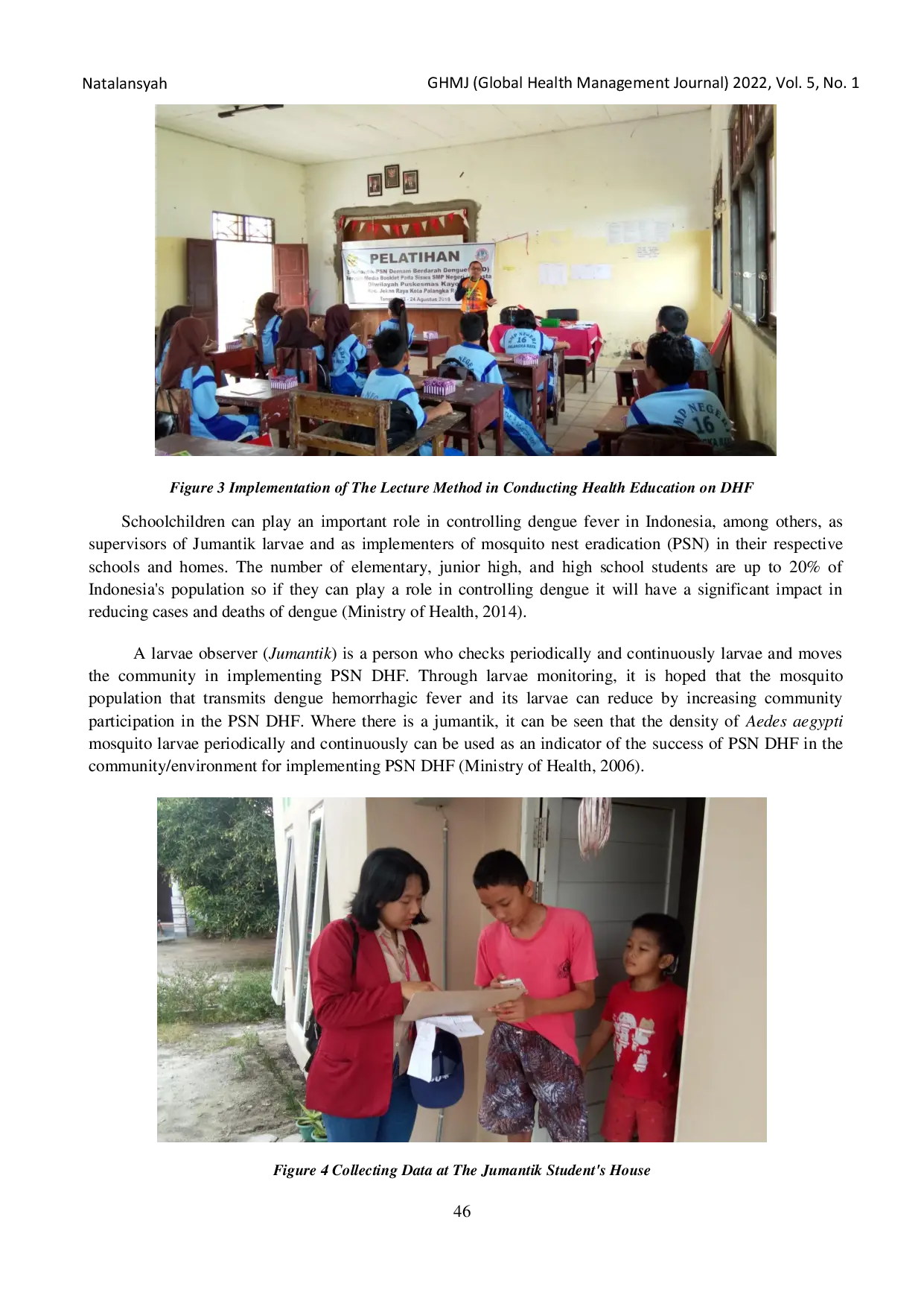 GHMJ (Global Health Management Journal)GHMJ (Global Health Management Journal)Demam Berdarah Dengue (DBD) merupakan masalah kesehatan masyarakat yang signifikan di Indonesia, ditularkan oleh nyamuk Aedes. Pencegahan DBD memerlukan upaya pemberantasan sarang nyamuk (PSN) dan peran aktif juru pemantau jentik (Jumantik). Dokumen ini menguraikan pentingnya peran Jumantik-PSN dalam upaya pencegahan dan pengendalian DBD, termasuk melalui kegiatan pengabdian masyarakat berupa penyuluhan kesehatan. Intervensi ini terbukti secara signifikan meningkatkan pengetahuan masyarakat, khususnya di lingkungan sekolah, mengenai DBD. Hasil ini menunjukkan bahwa edukasi berkelanjutan dan pelibatan komunitas, seperti program Jumantik-PSN, merupakan strategi efektif untuk meningkatkan kesadaran dan kapasitas pencegahan DBD di masyarakat.