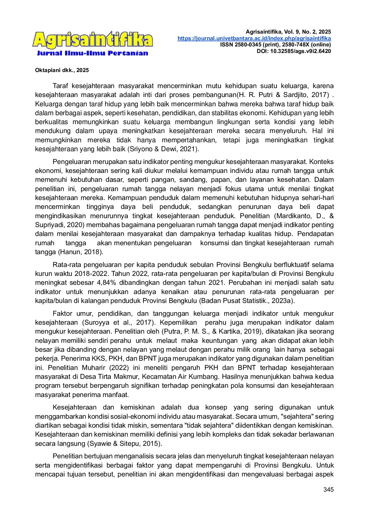 Agrisaintifika: Jurnal Ilmu-Ilmu PertanianAgrisaintifika: Jurnal Ilmu-Ilmu PertanianProvinsi Bengkulu memiliki potensi laut yang besar dan garis pantai yang panjang, kesejahteraan nelayan masih menjadi isu yang perlu diperhatikan. Penelitian ini bertujuan untuk menganalisis tingkat kesejahteraan serta faktor-faktor yang mempengaruhi kesejahteraan rumah tangga nelayan di Provinsi Bengkulu. Lokasi penelitian yaitu di Provinsi Bengkulu. Dalam penelitian ini, sampel yang digunakan terdiri dari 200 rumah tangga nelayan yang dipilih secara purposive. Data dikumpulkan melalui sumber sekunder dari Survei Sosial Ekonomi Nasional (Susenas) 2023 periode Maret dan instansi terkait. Untuk analisis data digunakan metode deskriptif kuantitatif dan regresi logistik biner untuk melihat faktor-faktor yang mempengaruhi kesejahteraan rumah tangga nelayan. Hasil menunjukkan bahwa Tingkat kesejahteraan tertinggi terdapat di Kabupaten Mukomuko dengan persentase 93,75%. Faktor-faktor yang terbukti berpengaruh probabilitas terhadap kesejahteraan rumah tangga nelayan meliputi jumlah tanggungan keluarga dan status penerima Bantuan Pangan Non‑Tunai (BPNT). Sebaliknya, variabel seperti umur, lama pendidikan, kepemilikan perahu, serta partisipasi dalam program bantuan seperti Kartu Keluarga Sejahtera (KKS) dan Program Keluarga Harapan (PKH), probabilitas tidak berpengaruh signifikan terhadap kesejahteraan rumah tangga nelayan di Provinsi Bengkulu.