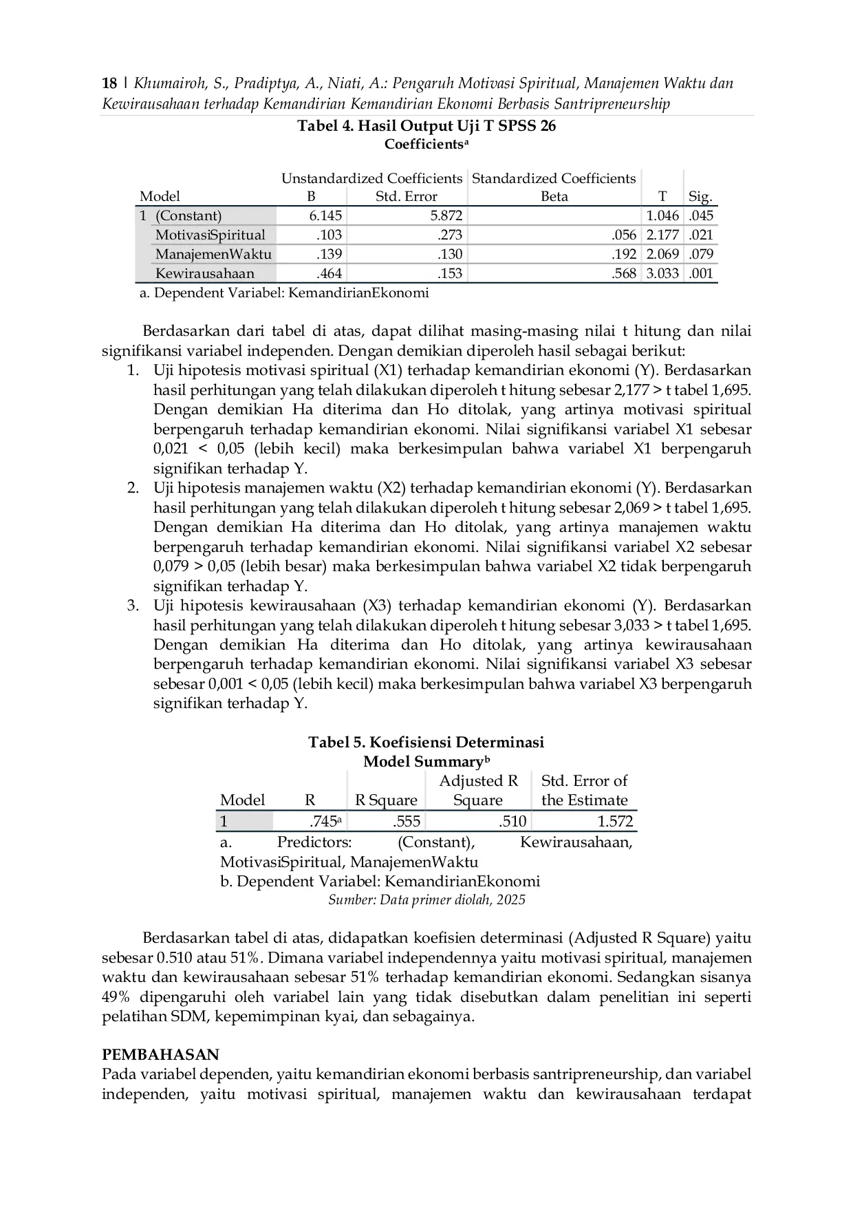 Motivasi spiritual berpengaruh positif dan signifikan terhadap kemandirian ekonomi, artinya semakin tinggi motivasi spiritual santri, semakin tinggi pula kemandirian ekonomi di Pondok Pesantren LP3IA Narukan.Manajemen waktu berpengaruh positif namun tidak signifikan terhadap kemandirian ekonomi, menunjukkan bahwa kemampuan mengatur waktu belum memberikan dampak kuat terhadap kemandirian ekonomi santri.Kewirausahaan berpengaruh positif dan signifikan terhadap kemandirian ekonomi, menandakan bahwa pengembangan jiwa kewirausahaan sangat penting dalam mendorong kemandirian ekonomi berbasis santripreneurship.