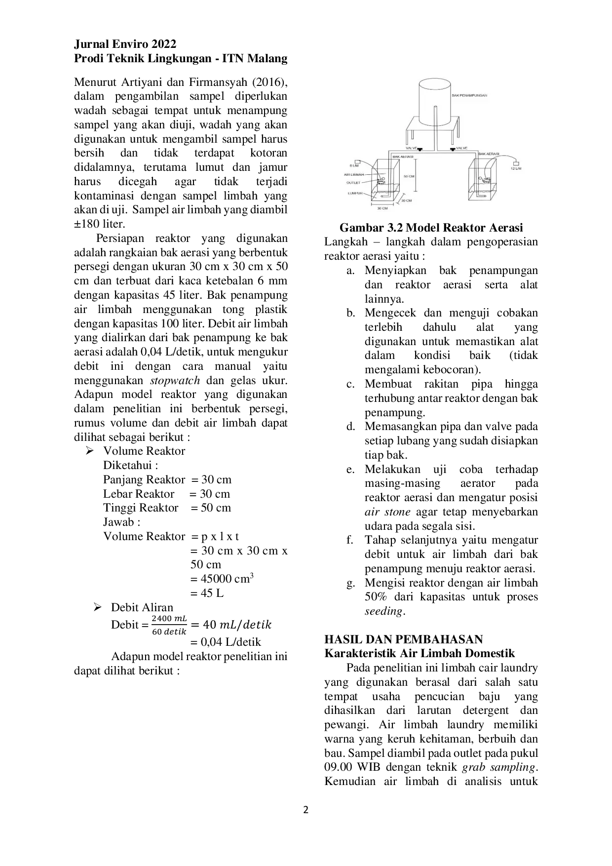 Jurnal Mahasiswa "ENVIRO"Jurnal Mahasiswa "ENVIRO"Deterjen yang digunakan sebagian besar menggunakan LAS (Linier Alkyl Sulfonat) yang merupakan Anonik Surfaktan yang berfungsi menurunkan tegangan permukaan air. Limbah laundry yang dihasilkan sebagian besar langsung dibuang ke selokan atau badan air tanpa pengolahan terlebih dahulu, sehingga akan menimbulkan dampak negatif terhadap perairan itu sendiri, seperti eutrofikasi kadar oksigen berkurang drastis dan menyebabkan biota air mengalami degradasi serta dapat membahayakan kesehatan manusia jika dikonsumsi atau di pakai secara langsung. Tujuan penelitian ini menganalisis pengaruh waktu detensi dan debit udara terhadap parameter BOD dan COD dalam air limbah laundry.