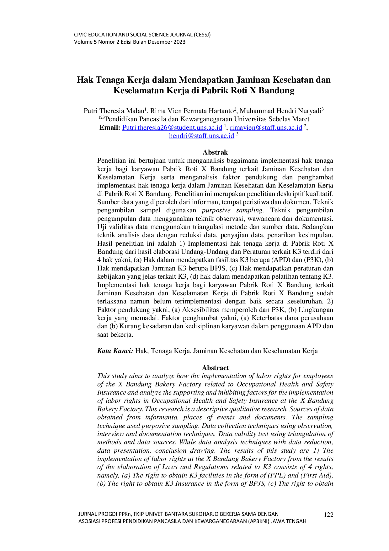 Civics Education and Social Science Journal (CESSJ)Civics Education and Social Science Journal (CESSJ)Penelitian ini bertujuan untuk menganalisis bagaimana implementasi hak tenaga kerja bagi karyawan Pabrik Roti X Bandung terkait Jaminan Kesehatan dan Keselamatan Kerja serta menganalisis faktor pendukung dan penghambat implementasi hak tenaga kerja dalam Jaminan Kesehatan dan Keselamatan Kerja di Pabrik Roti X Bandung. Penelitian ini merupakan penelitian deskriptif kualitatif. Sumber data yang diperoleh dari informan, tempat peristiwa dan dokumen. Teknik pengambilan sampel digunakan purposive sampling. Teknik pengumpulan data menggunakan teknik observasi, wawancara dan dokumentasi. Uji validitas data menggunakan triangulasi metode dan sumber data. Sedangkan teknik analisis data dengan reduksi data, penyajian data, penarikan kesimpulan. Hasil penelitian ini adalah 1) Implementasi hak tenaga kerja di Pabrik Roti X Bandung dari hasil elaborasi Undang-Undang dan Peraturan terkait K3 terdiri dari 4 hak yakni, (a) Hak dalam mendapatkan fasilitas K3 berupa (APD) dan (P3K), (b) Hak mendapatkan Jaminan K3 berupa BPJS, (c) Hak mendapatkan peraturan dan kebijakan yang jelas terkait K3, (d) hak dalam mendapatkan pelatihan tentang K3. Implementasi hak tenaga kerja bagi karyawan Pabrik Roti X Bandung terkait Jaminan Kesehatan dan Keselamatan Kerja di Pabrik Roti X Bandung sudah terlaksana namun belum terimplementasi dengan baik secara keseluruhan. 2) Faktor pendukung yakni, (a) Aksesibilitas memperoleh dan P3K, (b) Lingkungan kerja yang memadai. Faktor penghambat yakni, (a) Keterbatasan dana perusahaan dan (b) Kurang kesadaran dan kedisiplinan karyawan dalam penggunaan APD dan saat bekerja.