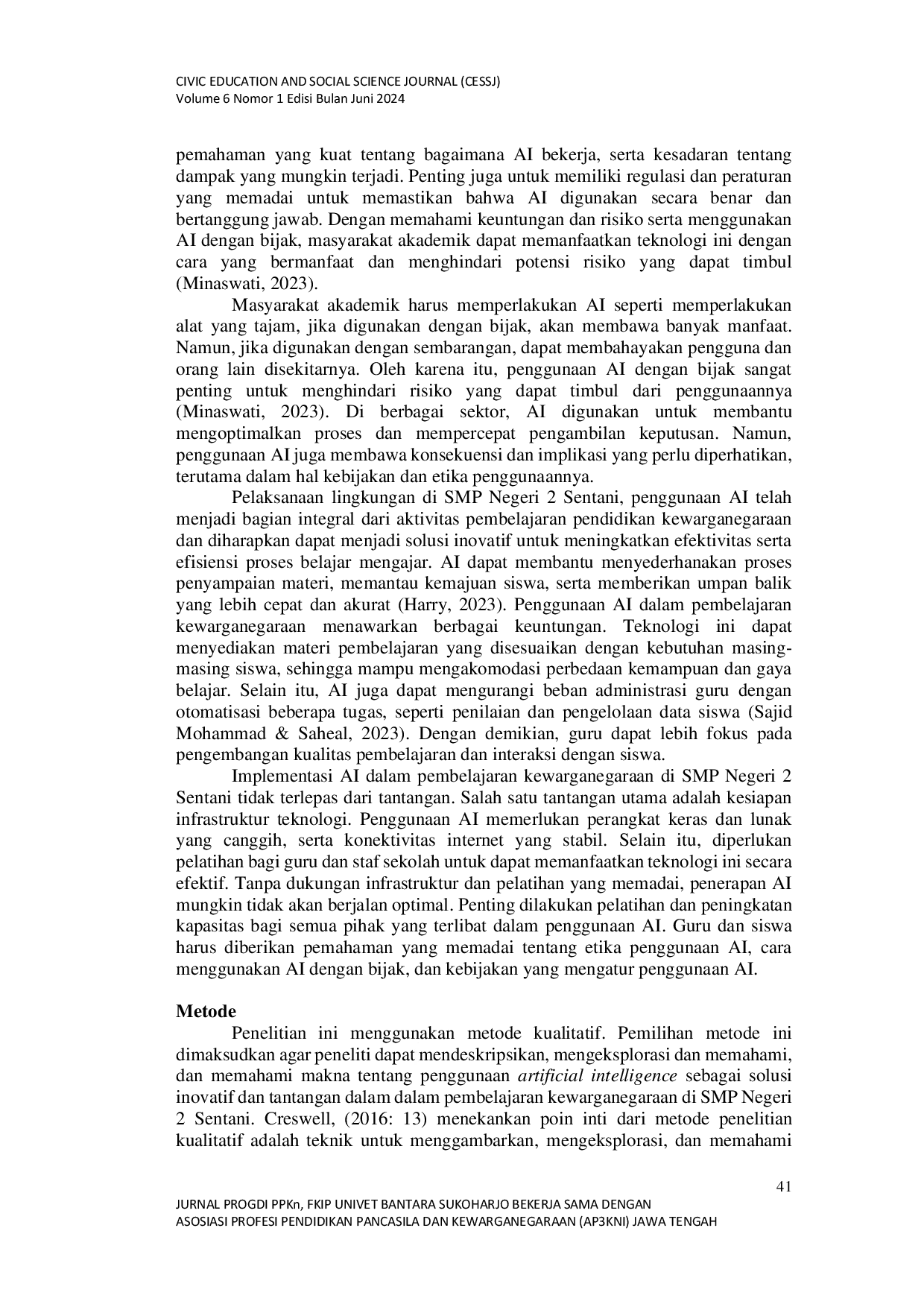 Penggunaan kecerdasan buatan (AI) dalam pembelajaran kewarganegaraan di SMP Negeri 2 Sentani menawarkan solusi inovatif namun juga menghadirkan tantangan yang perlu diatasi.Meskipun AI dapat meningkatkan efisiensi dan efektivitas pembelajaran, guru tetap memiliki peran penting dalam membimbing siswa, membangun hubungan interpersonal, dan memberikan dukungan emosional yang tidak dapat digantikan oleh AI.Integrasi AI yang bijak sangat diperlukan untuk mendukung kualitas pembelajaran tanpa mengabaikan aspek humanis dalam pendidikan.