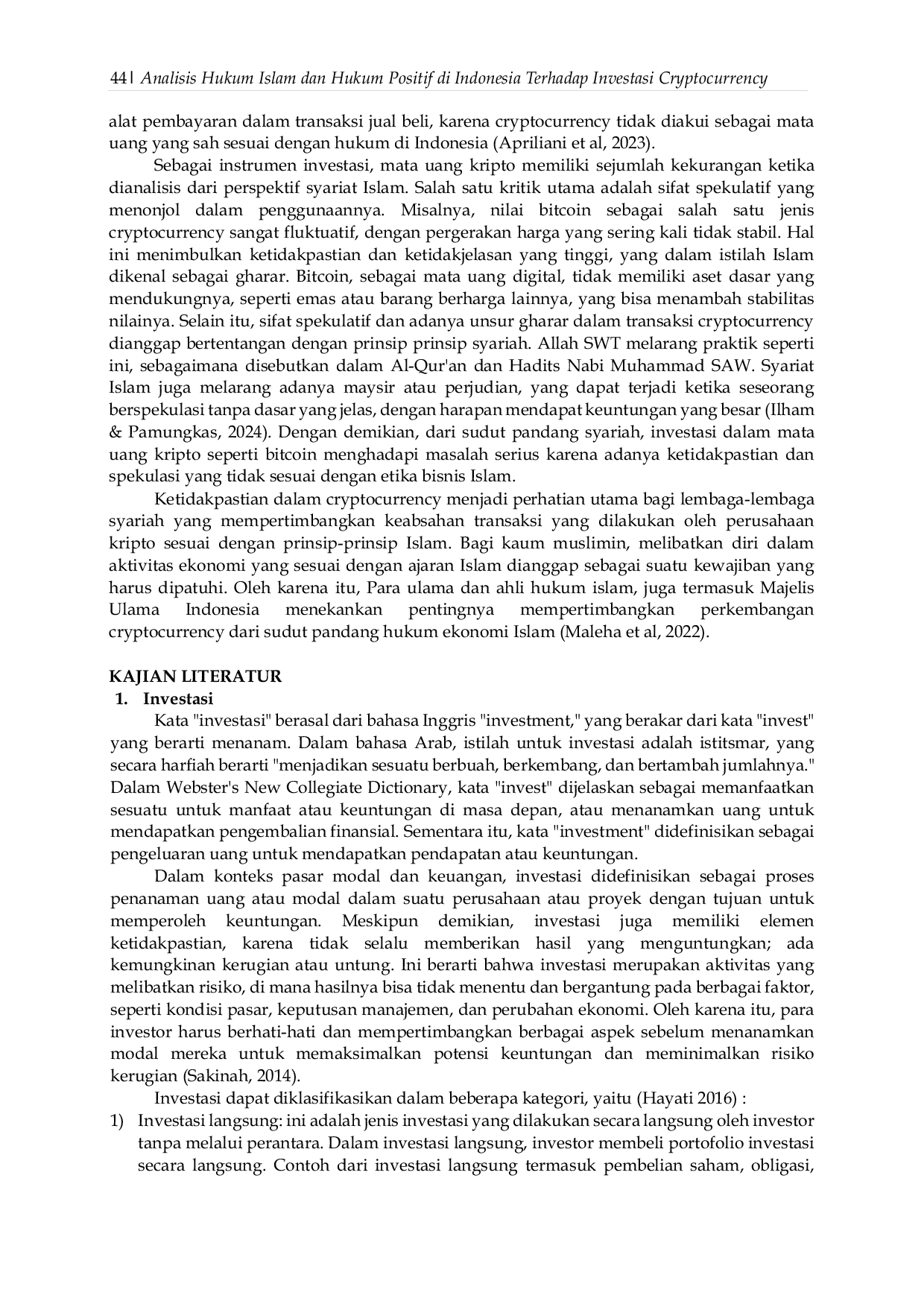 Dalam perspektif hukum Islam, cryptocurrency dianggap bermasalah karena mengandung unsur gharar (ketidakpastian) dan spekulasi.Mayoritas ulama, termasuk Majelis Ulama Indonesia (MUI), Nahdhatul Ulama (NU), dan Muhammadiyah, menyatakan bahwa penggunaan cryptocurrency sebagai alat investasi adalah haram.Alasannya adalah volatilitas tinggi, ketidakjelasan nilai, serta risiko terkait aktivitas ilegal.Namun, beberapa ulama seperti Mufti Muhammad Abu Bakar, Monzer Kahf dan Mohd Daud Bakar membolehkan (mubah) cryptocurrency sebagai komoditas yang dapat diinvestasikan dengan mekanisme yang transparan dan sesuai prinsip syariah.Hukum positif di Indonesia mengakui cryptocurrency sebagai komoditas yang dapat diperdagangkan dalam perdagangan berjangka, namun tidak sebagai alat pembayaran sah.Hal ini diatur dalam Permendag Nomor 99 Tahun 2018 dan didukung oleh serangkaian peraturan Bappebti, seperti Peraturan Nomor 3, 5, 9 Tahun 2019.Peraturan ini mengatur perdagangan aset kripto hanya di bursa yang diawasi Bappebti, dengan persyaratan ketat terkait keamanan, manajemen risiko, dan perlindungan data.Selain itu, Bappebti menetapkan kriteria bagi aset kripto yang layak diperdagangkan, guna melindungi investor dan menjaga stabilitas pasar.Perlindungan hukum dalam investasi cryptocurrency di Indonesia terbagi menjadi preventif dan represif.Perlindungan preventif diatur oleh Undang undang Nomor 8 Tahun 1999 tentang perlindungan konsumen.Kemudian diatur melalui peraturan Bappebti Nomor 19 Tahun 2019, yang menetapkan pedagang aset kripto harus terdaftar, menjaga dana nasabah di rekening terpisah, dan memenuhi standar keamanan.Adapun Perlindungan represif mencakup penyelesaian sengketa melalui jalur litigasi di pengadilan atau non-litigasi, seperti mediasi dan arbitrase melalui BAKTI, untuk memberikan perlindungan hukum yang lebih cepat dan efisien.