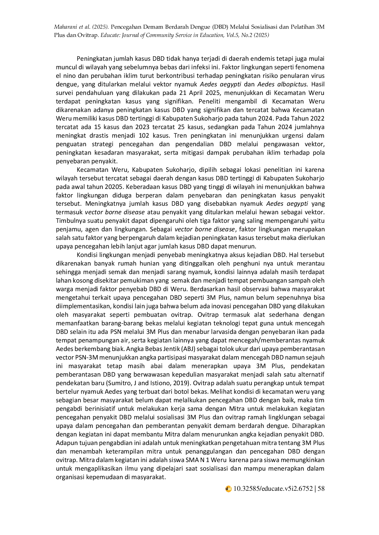 Educate: Journal of Community Service in EducationEducate: Journal of Community Service in EducationKecamatan Weru mengalami peningkatan kasus Demam Berdarah Dengue (DBD) pada tahun 2022-2024, dengan 15, 25, dan 102 kasus berturut-turut. Penguatan strategi pencegahan dan pengendalian DBD diperlukan melalui pengawasan vektor dan peningkatan kesadaran masyarakat terkait pola penyebaran penyakit dengan kegiatan sosialisasi 3M Plus dan ovitrap ramah lingkungan. Tujuan dari pengabdian ini adalah untuk meningkatkan pengetahuan mitra tentang 3M Plus dan keterampilan mitra dalam penanggulangan dan pencegahan DBD dengan ovitrap. Kegiatan pengabdian dilaksanakan di SMA N 1 Weru pada 25 April 2025 dengan sasaran 69 siswa SMA. Metode kegiatan meliputi perizinan, sosialisasi, pelatihan 3M Plus dan ovitrap. Hasil kegiatan menunjukkan perbedaan tingkat pengetahuan sebelum dan sesudah pelaksanaan sosialisasi dan pelatihan, dengan peningkatan rata-rata pengetahuan dari 55,65 menjadi 85,50. Peningkatan pengetahuan siswa diharapkan berdampak pada perubahan sikap dan perilaku positif dalam pencegahan DBD.