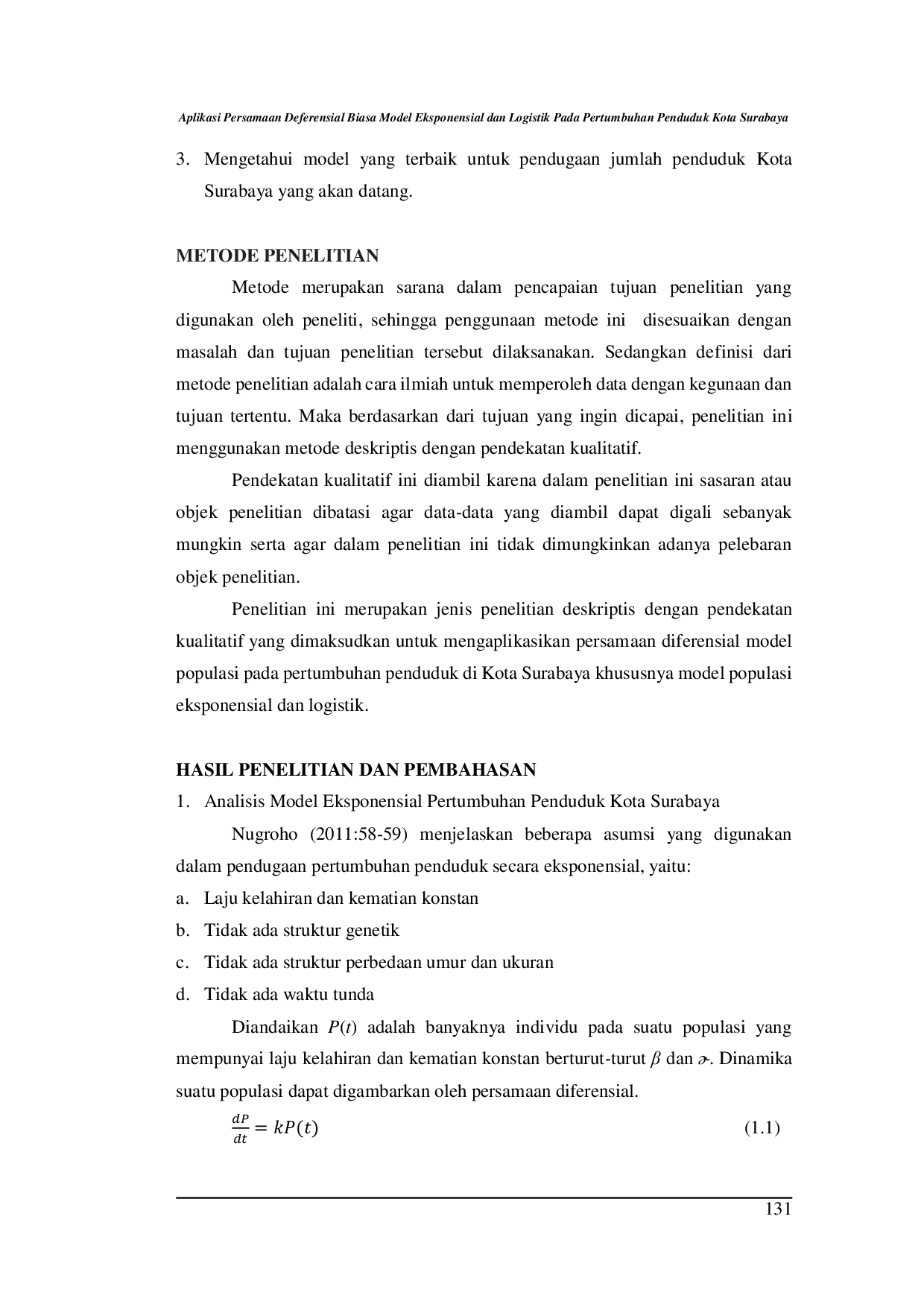 Dalam penelitian ini diperoleh dua model pertumbuhan penduduk menggunakan persamaan diferensial, yaitu model eksponensial dengan persamaan 𝑃(𝑡) = 3.321 𝑒^(−0,00676)𝑡 dan model logistik dengan persamaan 𝑃 = 3.Kedua model dianalisis dengan membandingkan hasil simulasi terhadap data aktual dari Dispendukcapil.Analisis menunjukkan bahwa model logistik memiliki galat lebih kecil dan lebih mendekati data sebenarnya.Dengan demikian, model logistik merupakan model yang lebih akurat untuk menduga jumlah penduduk Kota Surabaya pada masa mendatang.