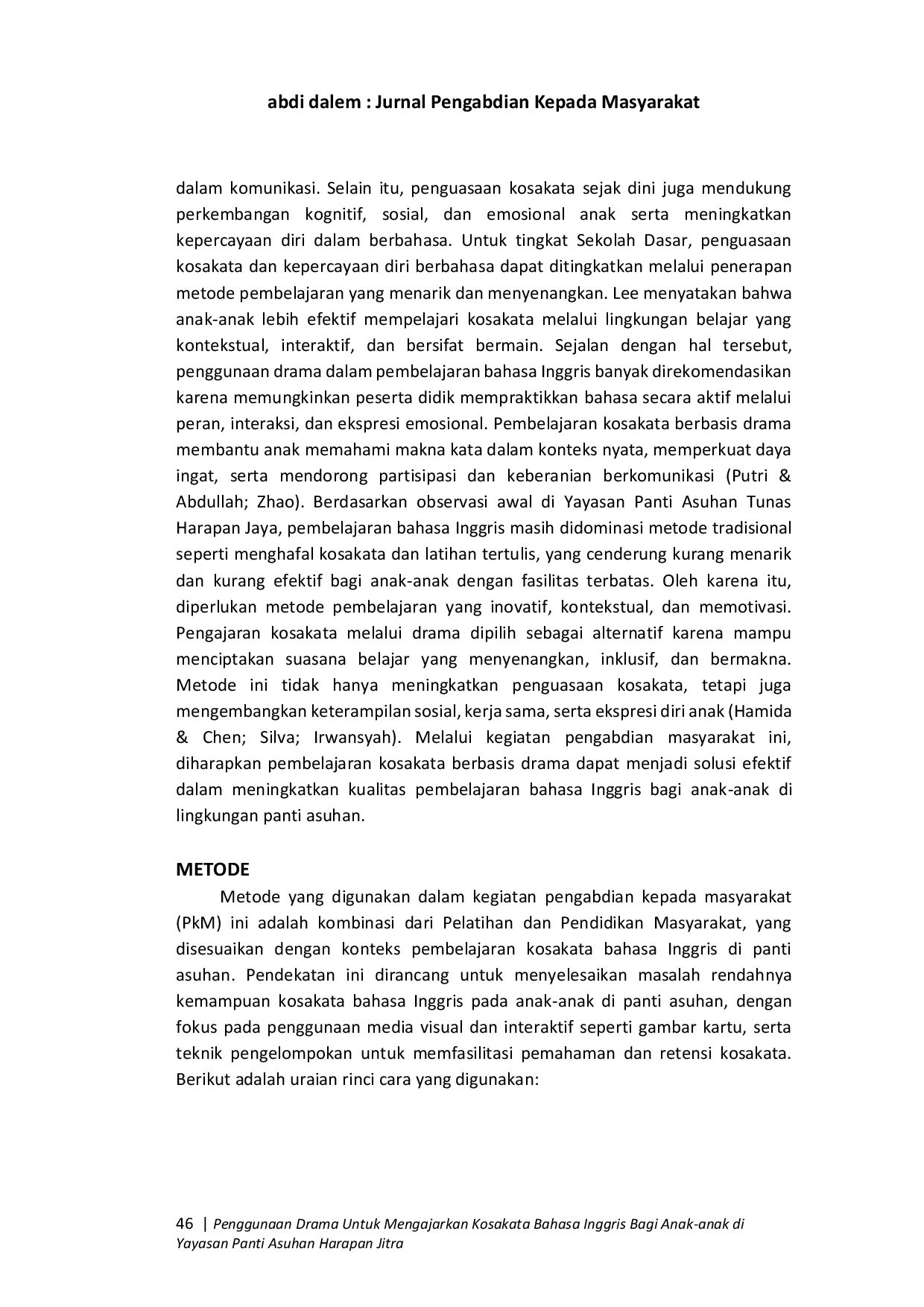 Kegiatan pengabdian kepada masyarakat yang dilaksanakan di Yayasan Panti Asuhan Tunas Harapan Jitra menunjukkan bahwa pembelajaran kosakata bahasa Inggris melalui pendekatan interaktif dan berbasis aktivitas efektif dalam meningkatkan penguasaan kosakata serta kepercayaan diri siswa.Penerapan metode Total Physical Response (TPR), mini drama, serta pemanfaatan media visual-audio terbukti mampu meningkatkan keterlibatan aktif dan pemahaman siswa terhadap berbagai tema kosakata, meliputi animals, fruits, colors, body parts, dan daily activities.Secara keseluruhan, program ini memberikan dampak positif terhadap kemampuan berbahasa Inggris siswa dan dapat direkomendasikan sebagai alternatif pembelajaran yang efektif di lingkungan pendidikan informal.