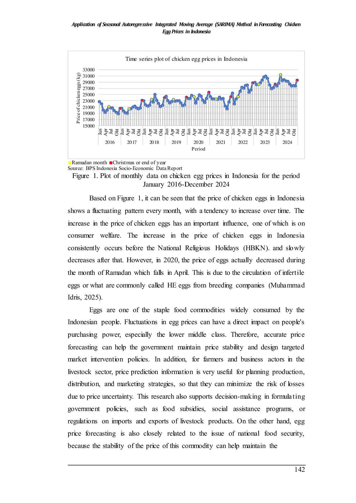 Studi ini menunjukkan bahwa peramalan harga telur ayam di Indonesia dari Januari 2025 hingga Desember 2026 akan mengalami fluktuasi naik.Penerapan metode Seasonal Autoregressive Integrated Moving Average (SARIMA) efektif dalam memprediksi harga telur ayam di Indonesia.Bagi petani dan distributor, hasil peramalan ini memungkinkan mereka untuk merencanakan produksi dan pengaturan harga, sehingga mengurangi fluktuasi harga yang merugikan.Bagi pembuat kebijakan, temuan ini mendukung formulasi kebijakan untuk stabilitas harga dan keamanan pangan.Studi ini menambah wawasan dalam literatur analisis harga komoditas dengan menunjukkan efektivitas metode SARIMA dan menawarkan pendekatan yang lebih akurat untuk peramalan harga.Namun, studi ini memiliki keterbatasan, termasuk faktor eksternal yang tidak diukur, seperti perubahan kebijakan, kondisi cuaca ekstrem, dan fluktuasi pasar global yang dapat mempengaruhi harga telur.