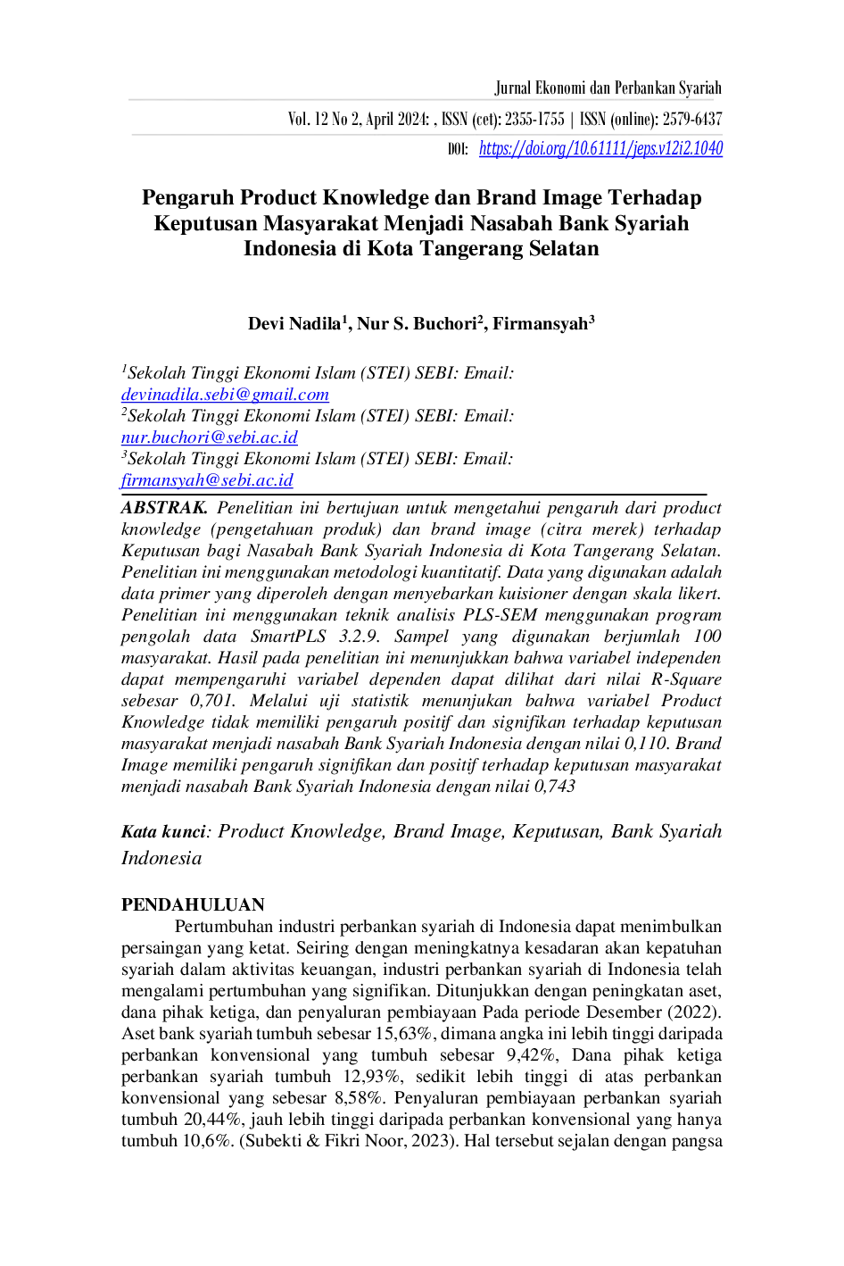 Jurnal Ekonomi dan Perbankan SyariahJurnal Ekonomi dan Perbankan SyariahPenelitian ini bertujuan untuk mengetahui pengaruh dari product knowledge (pengetahuan produk) dan brand image (citra merek) terhadap Keputusan bagi Nasabah Bank Syariah Indonesia di Kota Tangerang Selatan. Penelitian ini menggunakan metodologi kuantitatif dengan data primer yang diperoleh melalui kuisioner skala likert. Hasil penelitian menunjukkan bahwa variabel independen dapat mempengaruhi variabel dependen dengan nilai R-Square sebesar 0,701. Uji statistik menunjukkan bahwa variabel Product Knowledge tidak memiliki pengaruh positif dan signifikan terhadap keputusan masyarakat menjadi nasabah Bank Syariah Indonesia dengan nilai 0,110. Sementara itu, Brand Image memiliki pengaruh signifikan dan positif terhadap keputusan masyarakat menjadi nasabah Bank Syariah Indonesia dengan nilai 0,743.