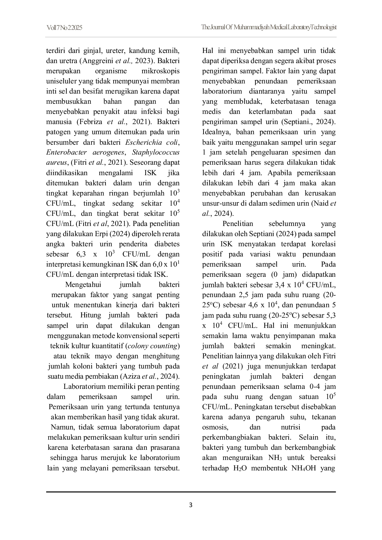 THE JOURNAL OF MUHAMMADIYAH MEDICAL LABORATORY TECHNOLOGISTTHE JOURNAL OF MUHAMMADIYAH MEDICAL LABORATORY TECHNOLOGISTLatar belakang: Diabetes Melitus (DM) merupakan gangguan metabolik kronik yang ditandai dengan hiperglikemia. Penderita DM rentan mengalami infeksi saluran kemih (ISK) karena tingginya kadar glukosa dalam urin yang mendukung pertumbuhan bakteri. Pemeriksaan urin yang tertunda dapat memengaruhi akurasi hasil, khususnya dalam pemeriksaan total bakteri. Tujuan: Penelitian ini dilakukan untuk mengetahui hasil pemeriksaan total bakteri pada urin pasien DM berdasarkan penyimpanan sampel pada suhu ruang dengan perlakuan lama waktu penyimpanan sampel 0 jam, 3 jam, 5 jam, dan 7 jam. Metode: Jenis penelitian ini adalah eksperimental laboratorium dengan desain cross-sectional. Sampel urin pasien DM diambil secara midstream, lalu dilakukan pemeriksaan total bakteri menggunakan teknik kultur kuantitatif (colony counting/teknik mayo). Hasil uji berupa jumlah koloni yang tumbuh pada media MacConkey Agar dikalikan 102 CFU/mL. Data dianalisis menggunakan uji statistik non-parametrik menggunakan uji Spearman sesuai distribusi data. Hasil: Berdasarkan hasil penelitian pada pemeriksaan segera (0 jam) didapatkan rata-rata jumlah koloni sebesar 3,78 x 102 CFU/mL, setelah dilakukan penyimpanan pada suhu ruang dengan waktu penundaan pemeriksaan 3 jam didapatkan rata-rata jumlah koloni sebesar 22,72 x 102 CFU/mL, pada penundaan pemeriksaan 5 jam sebesar 41,89 x 102 CFU/mL, dan pada penundaan pemeriksaan 7 jam sebesar 69,83 x 102 CFU/mL. Sedangkan hasil uji Spearman menunjukkan nilai koefisien korelasi lebih besar dari nilai signifikansi (p) 0.000 yaitu 0.973, yang berarti lama penundaan pemeriksaan berpengaruh terhadap jumlah koloni bakteri.