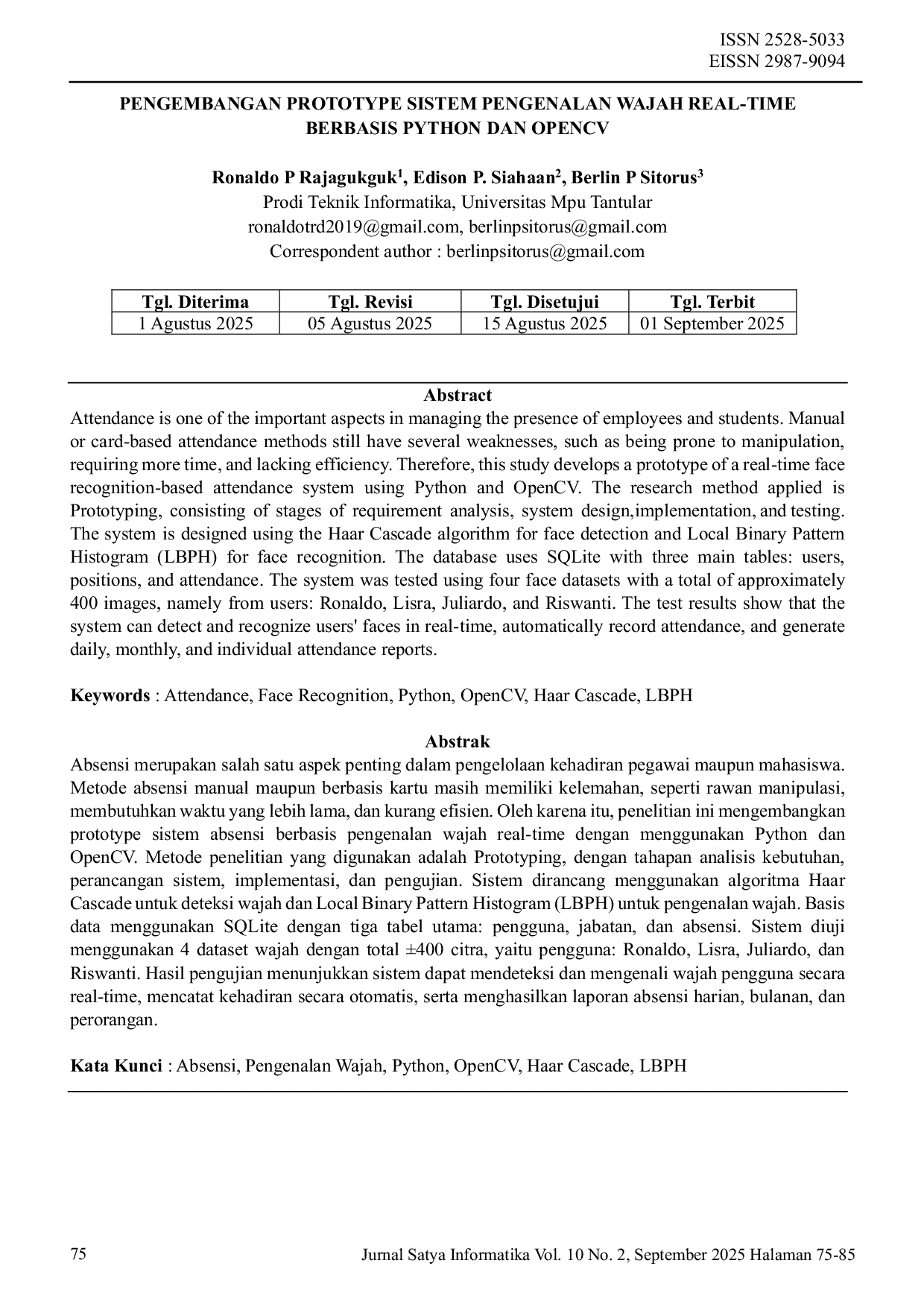 JURNAL SATYA INFORMATIKAJURNAL SATYA INFORMATIKAAbsensi merupakan salah satu aspek penting dalam pengelolaan kehadiran pegawai maupun mahasiswa. Metode absensi manual maupun berbasis kartu masih memiliki kelemahan, seperti rawan manipulasi, membutuhkan waktu yang lebih lama, dan kurang efisien. Oleh karena itu, penelitian ini mengembangkan prototype sistem absensi berbasis pengenalan wajah real-time dengan menggunakan Python dan OpenCV. Metode penelitian yang digunakan adalah Prototyping, dengan tahapan analisis kebutuhan, perancangan sistem, implementasi, dan pengujian. Sistem dirancang menggunakan algoritma Haar Cascade untuk deteksi wajah dan Local Binary Pattern Histogram (LBPH) untuk pengenalan wajah. Basis data menggunakan SQLite dengan tiga tabel utama: pengguna, jabatan, dan absensi. Sistem diuji menggunakan 4 dataset wajah dengan total ±400 citra, yaitu pengguna: Ronaldo, Lisra, Juliardo, dan Riswanti. Hasil pengujian menunjukkan sistem dapat mendeteksi dan mengenali wajah pengguna secara real-time, mencatat kehadiran secara otomatis, serta menghasilkan laporan absensi harian, bulanan, dan perorangan.