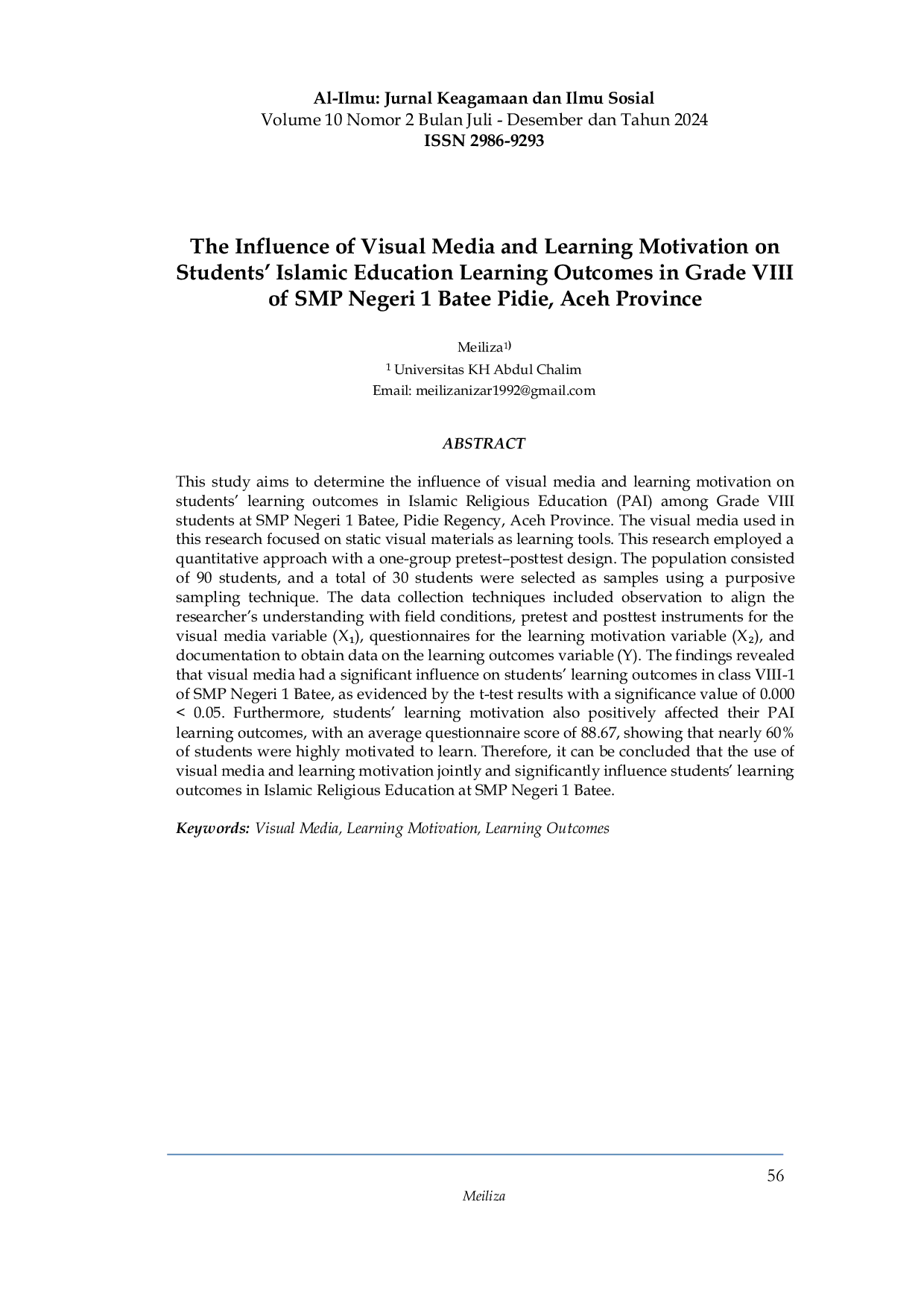 AL-ILMU : Jurnal Keagamaan dan Ilmu SosialAL-ILMU : Jurnal Keagamaan dan Ilmu SosialPenelitian ini bertujuan untuk mengetahui pengaruh media visual dan motivasi belajar terhadap hasil belajar Pendidikan Agama Islam (PAI) pada peserta didik kelas VIII SMP Negeri 1 Batee Kabupaten Pidie, Provinsi Aceh. Media visual yang digunakan dalam penelitian ini berfokus pada media visual diam sebagai sarana pembelajaran. Jenis penelitian ini adalah penelitian kuantitatif dengan desain one group pretest-posttest design. Populasi penelitian terdiri dari 90 peserta didik, dengan jumlah sampel sebanyak 30 orang yang dipilih menggunakan teknik purposive sampling. Teknik pengumpulan data meliputi observasi, tes (pretest dan posttest) untuk variabel media visual (X₁), angket untuk variabel motivasi belajar (X₂), serta dokumentasi untuk memperoleh data hasil belajar (Y). Hasil penelitian menunjukkan bahwa terdapat pengaruh signifikan media visual terhadap hasil belajar siswa kelas VIII-1 SMP Negeri 1 Batee, yang ditunjukkan melalui uji-t dengan nilai signifikansi 0,000 < 0,05. Selain itu, hasil penelitian juga menunjukkan bahwa motivasi belajar peserta didik berpengaruh positif terhadap hasil belajar PAI, dengan nilai rata-rata angket sebesar 88,67 dan sekitar 60% peserta didik menunjukkan tingkat motivasi belajar yang tinggi. Dengan demikian, dapat disimpulkan bahwa penggunaan media visual dan motivasi belajar secara bersama-sama memberikan pengaruh yang signifikan terhadap peningkatan hasil belajar PAI pada peserta didik SMP Negeri 1 Batee.