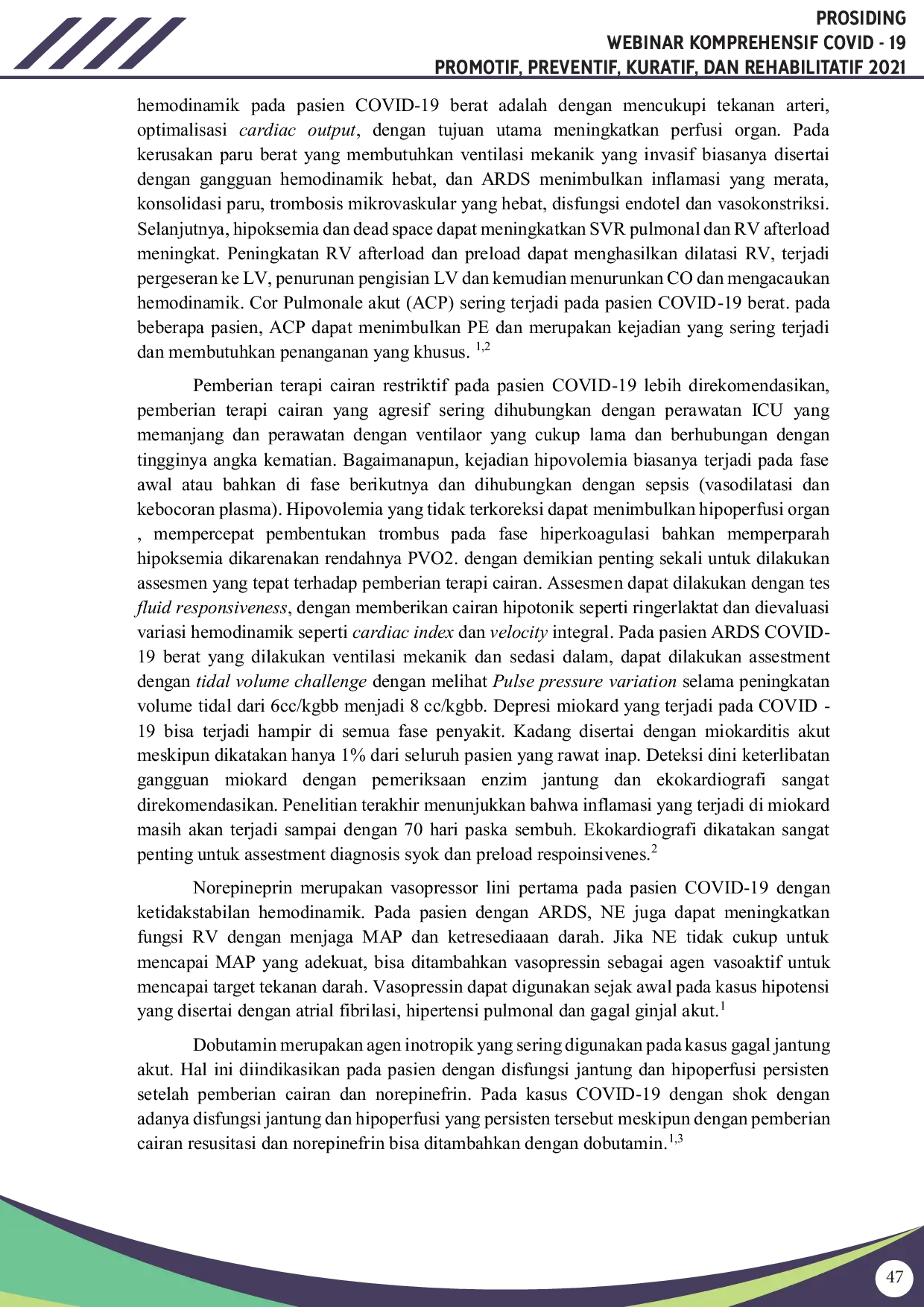 Proceeding Series Universitas Muhammadiyah SurabayaProceeding Series Universitas Muhammadiyah SurabayaInfeksi Covid-19 yang menjadi pandemi menjadi tantangan tersendiri bagi dokter dalam melakukan perawatan. Hal tersebut disebabkan karena patofisiologi Covid 19 yang sangat kompleks. Penyakit ini tidak hanya mempengaruhi paru namun juga organ lain. Gejala yang ditimbulkan juga beragam dari pasien tanpa gejala hingga yang bergejala berat. Pada pasien covid-19 yang bergejala berat maka diperlukan perawatan di ruang ICU. Perawatan di ruang ICU tersebut memerlukan monitoring dan terapi yang sangat kompleks yang hingga saat ini belum memiliki standar yang sama.