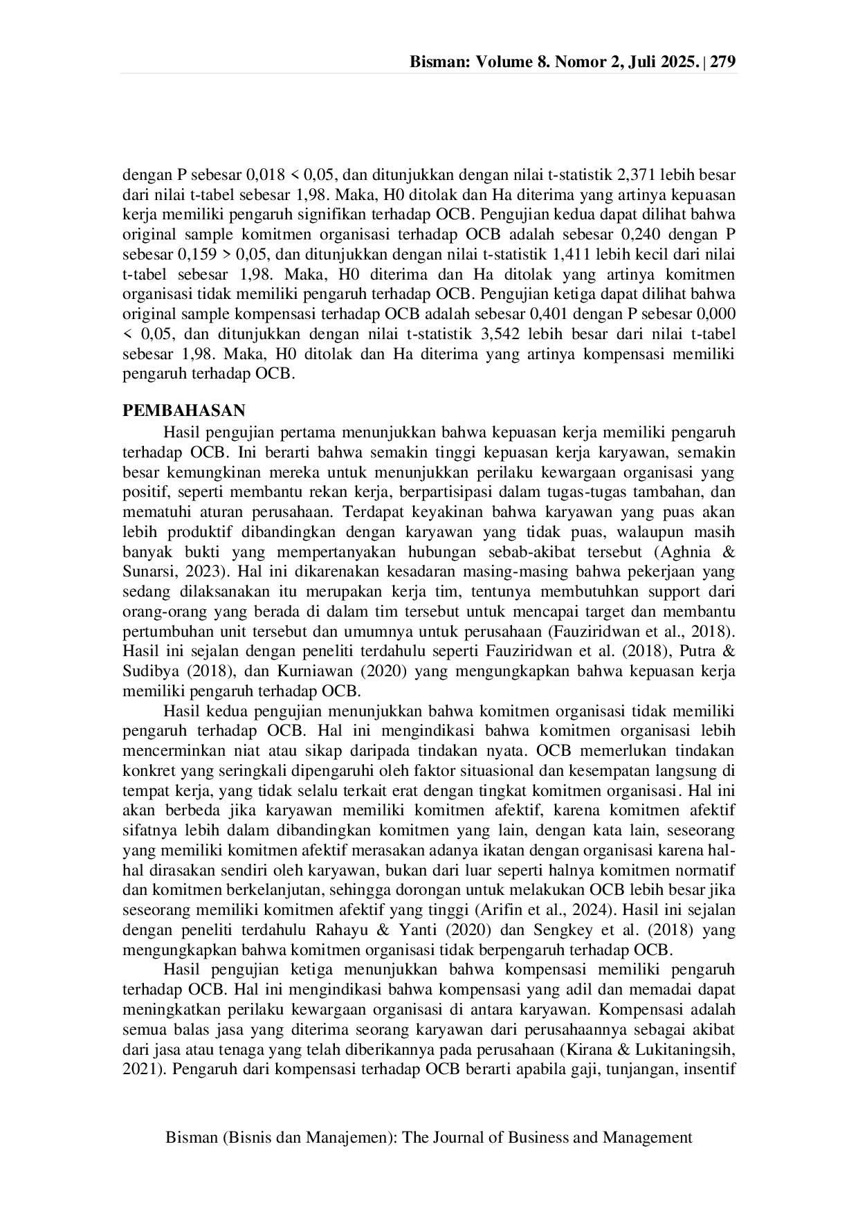 Bisman (Bisnis dan Manajemen): The Journal of Business and ManagementBisman (Bisnis dan Manajemen): The Journal of Business and ManagementPenelitian ini bertujuan untuk mengkaji pengaruh kepuasan kerja, komitmen organisasi, dan kompensasi terhadap perilaku kewargaan organisasi (Organizational Citizenship Behavior/OCB). Penelitian ini menggunakan data primer yang diperoleh dari hasil kuesioner. Populasi penelitian yang akan diamati adalah seluruh karyawan CV. Mandiri Abadi yang berjumlah 250 orang. Teknik pengambilan sampel yang digunakan dalam penelitian ini adalah teknik purposive sampling dengan jumlah total observasi sebanyak 100 responden. Teknik analisis yang digunakan adalah structural equation modeling (SEM) berbasis partial least square (PLS) dengan menggunakan SmartPLS 3. Temuan empiris ini mengungkapkan bahwa kepuasan kerja dan kompensasi berpengaruh terhadap OCB, sedangkan komitmen organisasi tidak berpengaruh terhadap OCB. Penelitian ini menunjukkan bahwa untuk meningkatkan OCB di CV. Mandiri Abadi, manajemen perlu memfokuskan diri pada strategi peningkatan kepuasan kerja dan pemberian kompensasi yang adil, sembari tetap membangun komitmen karyawan meskipun tidak secara langsung berpengaruh terhadap OCB.