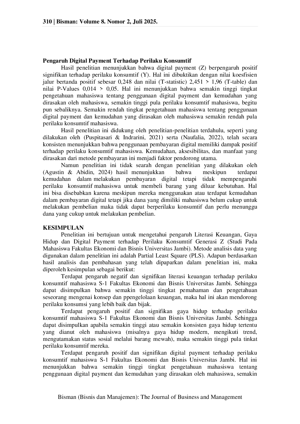 Bisman (Bisnis dan Manajemen): The Journal of Business and ManagementBisman (Bisnis dan Manajemen): The Journal of Business and ManagementPenelitian ini bertujuan untuk menganalisis pengaruh literasi keuangan, gaya hidup, dan penggunaan digital payment terhadap perilaku konsumtif generasi Z. Objek penelitian adalah mahasiswa S1 Fakultas Ekonomi dan Bisnis Universitas Jambi angkatan 2021–2024. Penelitian ini menggunakan pendekatan kuantitatif dengan metode analisis Partial Least Square (PLS) melalui bantuan software SmartPLS 4. Data primer dikumpulkan menggunakan kuesioner berbasis skala Likert 5 poin dan disebarkan melalui Google Form. Jumlah responden sebanyak 100 orang, yang ditentukan menggunakan rumus Slovin dari populasi sebanyak 3.131 mahasiswa. Hasil penelitian menunjukkan bahwa: (1) literasi keuangan berpengaruh negatif dan signifikan terhadap perilaku konsumtif; (2) gaya hidup berpengaruh positif dan signifikan terhadap perilaku konsumtif; dan (3) digital payment juga memiliki pengaruh positif dan signifikan terhadap perilaku konsumtif. Temuan ini memberikan implikasi bahwa peningkatan pemahaman keuangan dapat menekan perilaku konsumtif, sementara gaya hidup konsumtif dan kemudahan digital payment cenderung mendorong perilaku tersebut.
