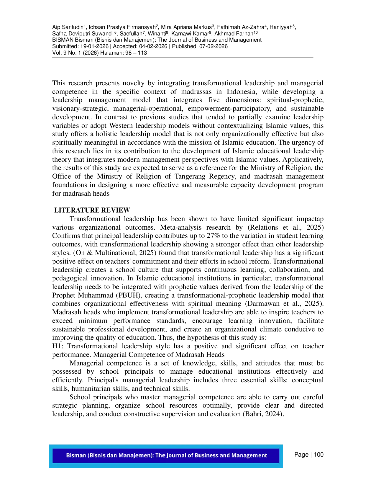 Bisman (Bisnis dan Manajemen): The Journal of Business and ManagementBisman (Bisnis dan Manajemen): The Journal of Business and ManagementProblems that occur in the field show that the performance of teachers in several Aliyah Madrasah in Tangerang Regency is still not optimal, which is reflected in the low discipline in the implementation of tasks, lack of innovation in learning methods, and the achievement of student learning outcomes that are not in accordance with the set educational quality standards. This condition indicates the existence of managerial and leadership factors of madrasah heads that need attention, considering the strategic role of madrasah heads as educational leaders in mobilizing all school resources to achieve educational goals, this study aims to analyze the contribution of leadership management to the governance of Islamic educational institutions by focusing on its influence on teacher performance and education quality. In the research conducted in this madrasah, a quantitative method was used with a survey research design on 85 teachers from three Aliyah Madrasah in Tangerang Regency. Data collection was carried out using a structured questionnaire, then analyzed through multiple linear regression with the help of SPSS software version 26. The results of the study revealed that the leadership style that is oriented towards change and development of madrasah heads has a positive influence on teacher performance (β=0.458; p<0.01) and quality of education (β=0.512; p<0.01). The managerial competence of madrasah heads also contributes significantly to the effectiveness of madrasah management (β=0.392; p<0.01). These findings affirm the importance of increasing the leadership capacity of madrasah heads through continuous training and strengthening of performance-based managerial systems to encourage the creation of quality education.
