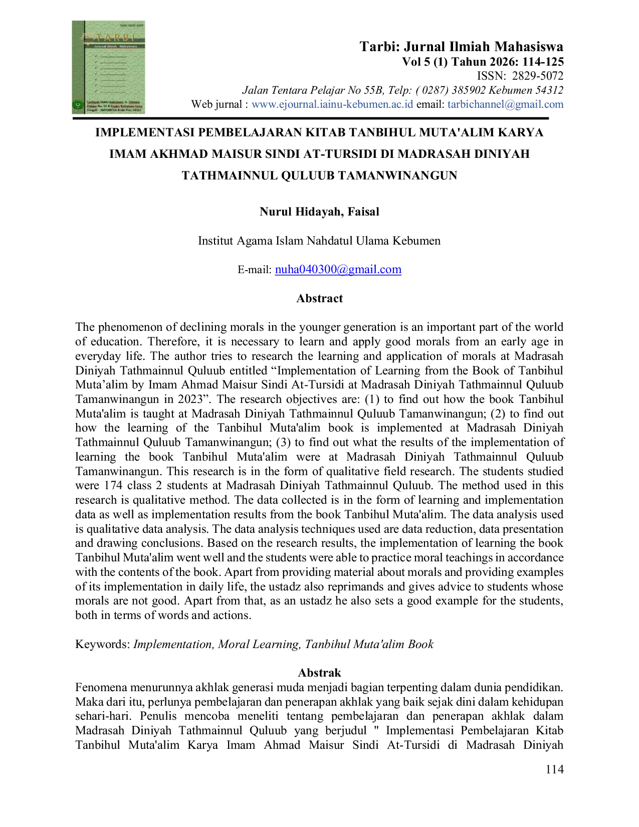 Tarbi: Jurnal Ilmiah MahasiswaTarbi: Jurnal Ilmiah MahasiswaFenomena menurunnya akhlak generasi muda menjadi bagian terpenting dalam dunia pendidikan. Maka dari itu, perlunya pembelajaran dan penerapan akhlak yang baik sejak dini dalam kehidupan sehari-hari. Penulis mencoba meneliti tentang pembelajaran dan penerapan akhlak dalam Madrasah Diniyah Tathmainnul Quluub yang berjudul Implementasi Pembelajaran Kitab Tanbihul Mutaalim Karya Imam Ahmad Maisur Sindi At-Tursidi di Madrasah Diniyah Tathmainnul Quluub Tamanwinangun Tahun 2023. Tujuan penelitian adalah: (1) untuk mengetahui bagaimana pembelajaran kitab Tanbihul Mutaalim di Madrasah Diniyah Tathmainnul Quluub Tamanwinangun; (2) untuk mengetahui bagaimana implementasi pembelajaran kitab Tanbihul Mutaalim di Madrasah Diniyah Tathmainnul Quluub Tamanwinangun; (3) untuk mengetahui bagaimana hasil implementasi pembelajaran kitab Tanbihul Mutaalim di Madrasah Diniyah Tathmainnul Quluub Tamanwinangun. Penelitian ini berupa penelitian kualitatif field research. Santri yang diteliti adalah santri kelas 2 Madrasah Diniyah Tathmainnul Quluub sejumlah 174 santri. Metode yang digunakan dalam penelitian ini adalah metode kualitatif. Data yang dikumpulkan berupa data pelaksanaan pembelajaran dan implementasi serta hasil implementasi dari kitab Tanbihul Mutaalim. Analisis data yang digunakan adalah analisis data kualitatif. Teknik analisis data yang digunakan adalah reduksi data, penyajian data dan penarikan kesimpulan. Berdasarkan hasil penelitian implementasi pembelajaran kitab Tanbihul Mutaalim berjalan dengan baik dan santri mampu mengamalkan ajaran akhlak sesuai dengan isi dari kitab tersebut. Selain memberikan materi tentang akhlak dan memberikan contoh implementasinya dalam kehidupan sehari-hari, ustadz juga menegur dan memberi nasehat kepada santri yang akhlaknya kurang baik. Selain itu, sebagai seorang ustadz beliau juga memberi contoh yang baik kepada santri, baik dari segi ucapan maupun perbuatan.