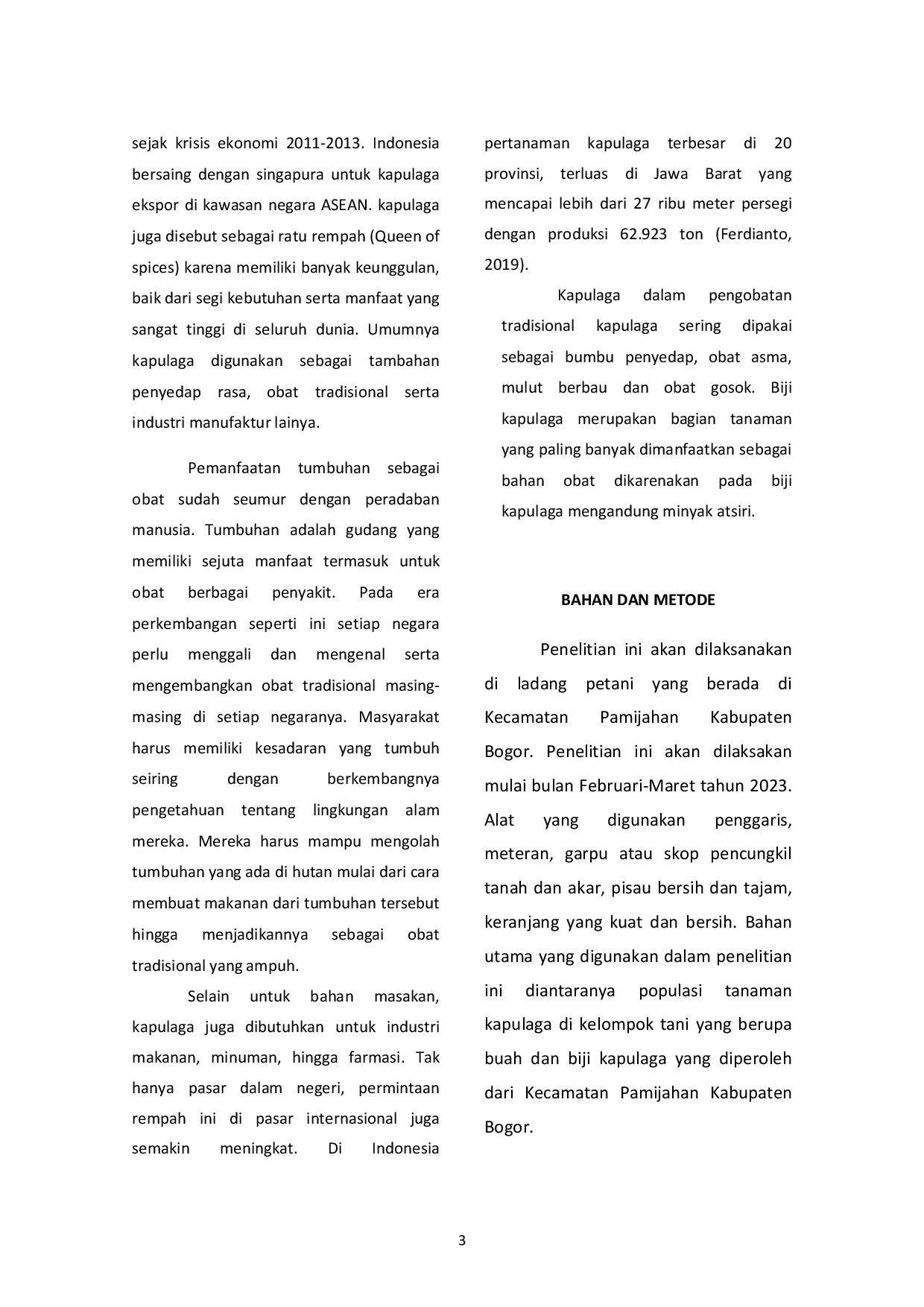 Penelitian lanjutan dapat mengkaji bagaimana variasi morfologi kapulaga lokal di Kecamatan Pamijahan dipengaruhi oleh perbedaan mikroklimat dan jenis naungan tanaman tumpang sari seperti kopi atau sengon. Selain itu, perlu diteliti sejauh mana kandungan minyak atsiri pada biji kapulaga lokal berbeda antar individu tanaman dan bagaimana hubungannya dengan ciri morfologis tertentu seperti ukuran biji atau aroma. Terakhir, penting untuk menyelidiki proses pengolahan dan pemasaran kapulaga oleh petani lokal, khususnya bagaimana mereka menyesuaikan praktik panen dan penyimpanan untuk mempertahankan kualitas aroma dan nilai jual di pasar modern, sehingga dapat mengidentifikasi titik kritis dalam rantai nilai yang memengaruhi pendapatan petani.