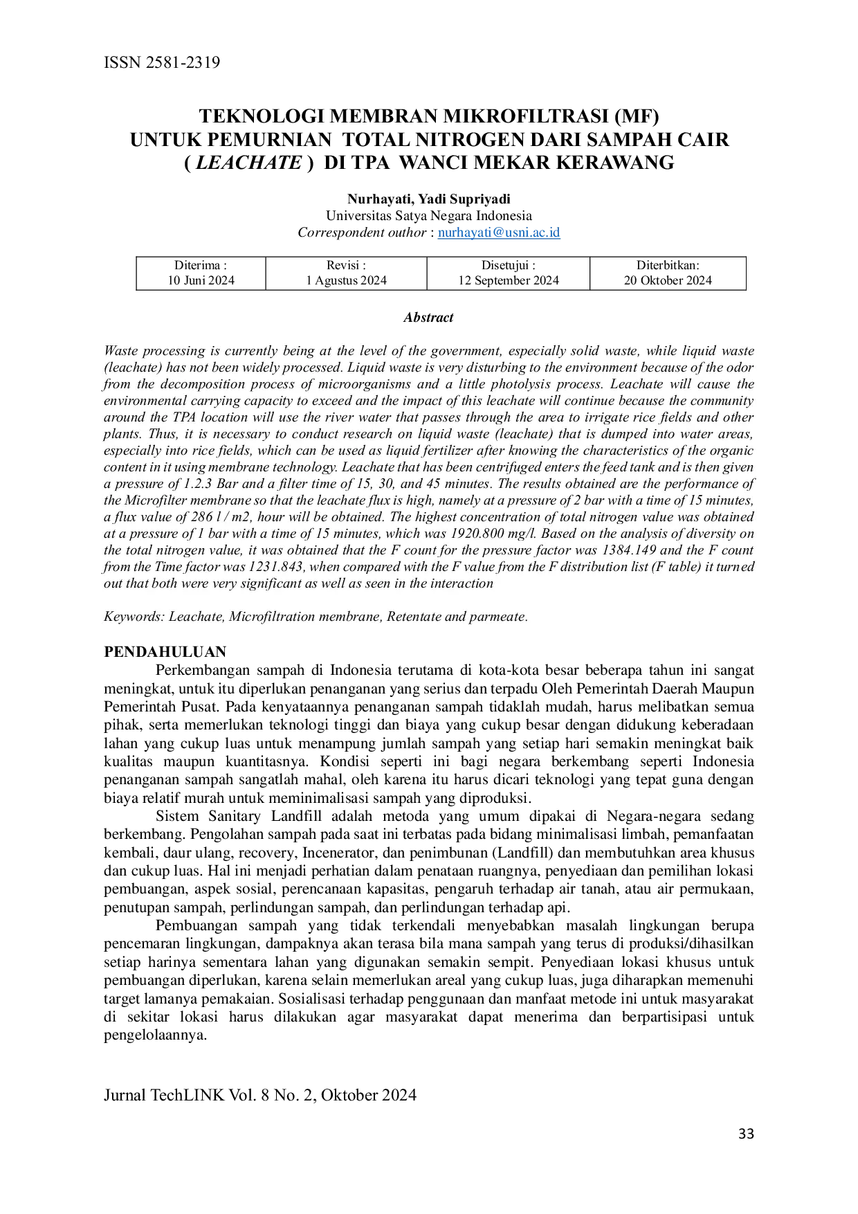 JURNAL TECHLINKJURNAL TECHLINKPengolahan sampah saat ini berada pada tingkat pemerintahan, terutama sampah padat, sedangkan sampah cair (leachate) belum banyak diolah. Sampah cair sangat mengganggu lingkungan karena bau dari proses dekomposisi mikroorganisme dan sedikit proses fotolisis. Leachate akan menyebabkan daya dukung lingkungan terlampaui, dan dampaknya berkelanjutan karena masyarakat di sekitar lokasi TPA menggunakan air sungai yang melewati area tersebut untuk mengairi sawah dan tanaman lainnya. Oleh karena itu, perlu dilakukan penelitian terhadap sampah cair (leachate) yang dibuang ke perairan, terutama ke sawah, yang dapat dimanfaatkan sebagai pupuk cair setelah diketahui karakteristik kandungan organiknya menggunakan teknologi membran. Leachate yang telah disentrifugasi dimasukkan ke tangki umpan, kemudian diberi tekanan 1, 2, 3 bar dan waktu penyaringan 15, 30, dan 45 menit. Hasil yang diperoleh menunjukkan kinerja membran mikrofilter menghasilkan fluks leachate tinggi, yaitu pada tekanan 2 bar dengan waktu 15 menit, diperoleh nilai fluks sebesar 286 l/m2/jam. Konsentrasi total nitrogen tertinggi diperoleh pada tekanan 1 bar dengan waktu 15 menit, yaitu 1920,800 mg/l. Berdasarkan analisis keragaman terhadap nilai total nitrogen, diperoleh nilai F hitung untuk faktor tekanan sebesar 1384,149 dan faktor waktu sebesar 1231,843, yang dibandingkan dengan nilai F tabel menunjukkan keduanya sangat signifikan, termasuk pada interaksinya.