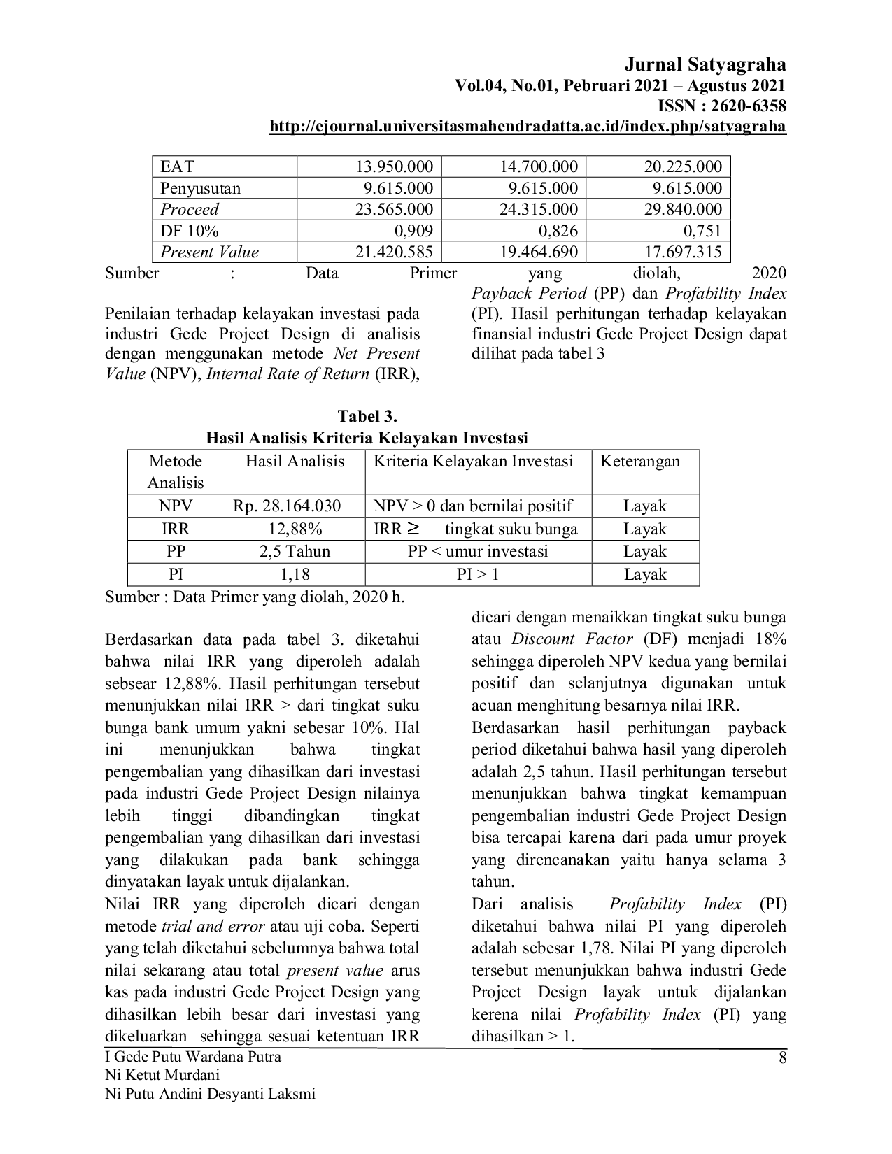 Jurnal Ilmiah SatyagrahaJurnal Ilmiah SatyagrahaPada era globalisasi saat ini, seiring bertambahnya waktu, teknologi akan semakin canggih, peranan desain grafis dalam segala bidang usaha sangat dibutuhkan. Hal itu dapat dibuktikan dengan banyaknya bidang usaha yang memanfaatkan keahlian designer grafis. Kebutuhan desain promosi yang sekarang semakin marak di dunia usaha, membuat desain grafis dituntut untuk bisa mengembangkan diri dalam membuat sebuah produk yang bisa menarik minat masyarakat. Penelitian ini dilakukan dengan tujuan untuk mengetahui kelayakan usaha Industri Gede Project Design ditinjau dari aspek pasar, aspek teknis, serta aspek manajemen dan SDM. Metode deskriptif kualitatif digunakan untuk aspek pasar, teknis, manajemen dan SDM, sementara aspek keuangan finansial dianalisis dengan menggunakan metode deskriptif kuantitatif dengan sistem manual melalui bantuan program Microsoft Excel. Hasil analisis menunjukkan bahwa industri Gede Project Design masih layak untuk dijalankan, namun ada beberapa hal yang perlu dievaluasi dan diperbaiki dalam strategi pemasaran terkait kegiatan promosi yang masih mengandalkan strategi door to door / mulut ke mulut sehingga pangsa pasar yang diserap masih belum sesuai target yang diinginkan, serta masalah pada manajemen perusahaan yang belum memiliki tenaga kerja yang tetap. Sementara itu, hasil analisis aspek finansial menunjukkan bahwa industri Gede Project Design layak untuk dijalankan, dengan NPV sebesar Rp 28.164.030, IRR sebesar 12,88%, Payback Period 2,5 tahun, dan PI sebesar 1,78.
