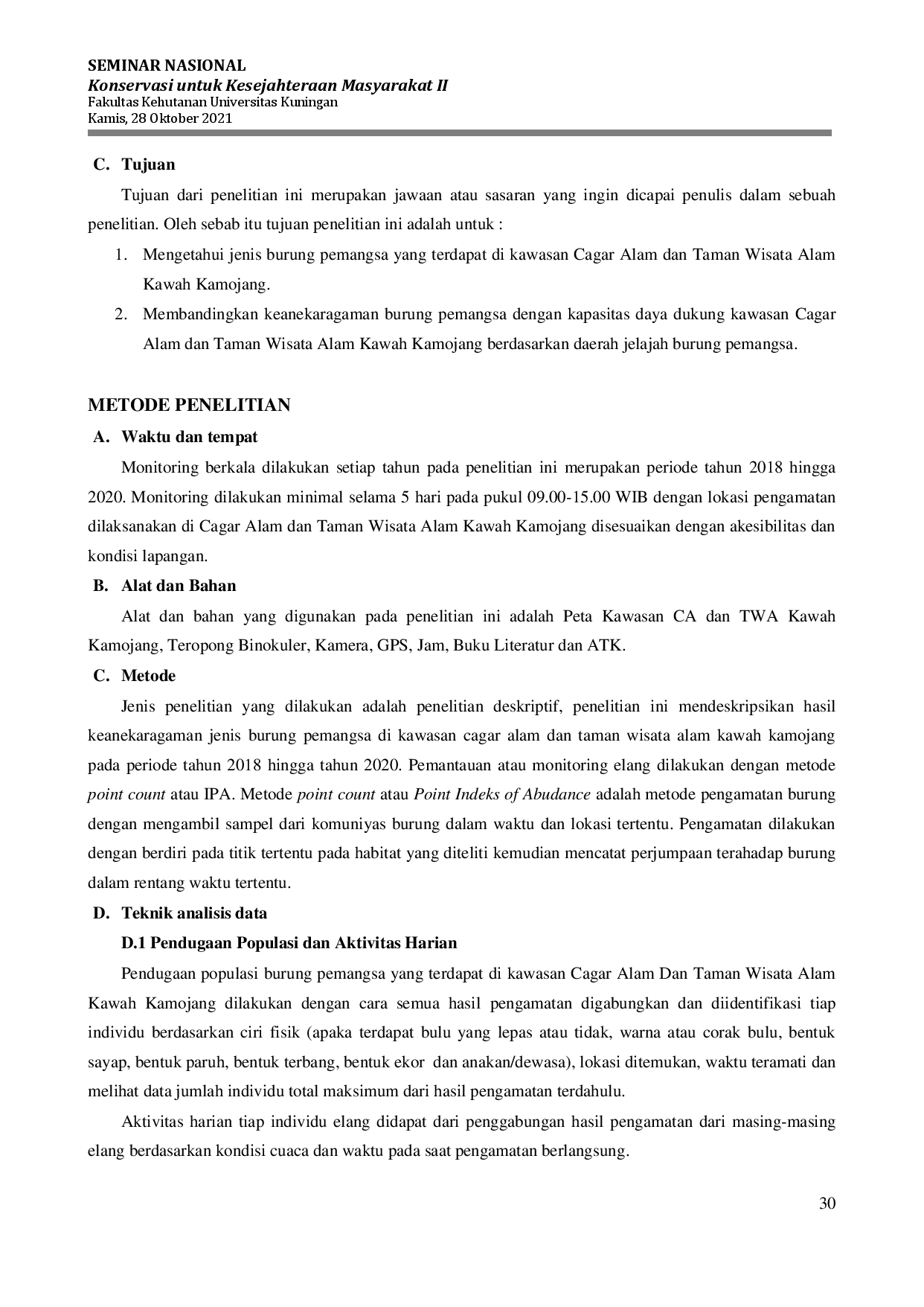 Prosiding FahutanProsiding FahutanElang Jawa merupakan salah satu jenis burung pemangsa endemik di Pulau Jawa yang dilindungi oleh negara. Keberadaan Elang Jawa memiliki peranan yang sangat penting dalam suatu ekosistem posisinya sebagai pemangsa tingkat puncak dalam ekosistem akan berpengaruh pada rantai makanan baik secara langsung maupun tidak langsung untuk itu konservsi terhadap burung pemangsa pada hal ini adalah Elang Jawa sangat penting dilakukan. Mempelajari populasi Elang Jawa adalah tujuan dari penelitian ini. Penelitian dilaksanakan dengan menganalisis hasil pemantauan sebelumnya yang telah dilakukan di Cagar Alam (CA) dan Taman Wisata Alam (TWA) Kawah Kamojang pada tahun 2018 sampai dengan tahun 2020. Hasilnya menunjukkan bahwa terapat 9 jenis Elang diantaranya adalah Elang Ular Bido, Elang Jawa, Elang Hitam, Elang Brontok Putih, Elang Brontok Fase Gelap, Elang Brontok, Elang Alap Jambul, Elang Alap dan Alap-Alap Sapi. Perjumpaan terbanyak pada Elang Ular Bido pada tahun 2020 terdapat 3 perjumpaan, tahun 2019 terdapat 1 perjumpaan dan tahun 2020 terdapat 7 perjumpaan. Kemudian jenis Elang Brontok pada tahun 2018 terdapat 4 perjumpaan, tahun 2019 terdapat 2 perjumpaan dan tahun 2020 terdapat 9 perjumpaan. Berdasarkan hasil penelitan Tri Widodo (2004) rerata luasan daerah jelajah Elang Jawa adalah ±2,51 Km2, dari total data pemantauan Elang yang ada terdapat 40 perjumpaan individu Elang jika dibandingkan dengan daya dukung kawasan CA/TWA Kawah Kamojang yang memiliki luas 8.298,196 Ha dan total kebutuhan daerah jelajah Elang 100,4 Km2 maka kawasan CA/TWA Kawah Kamojang sudah dapat dikatan cukup over populasi atau terdapat tumpang tindih daerah jelajah.