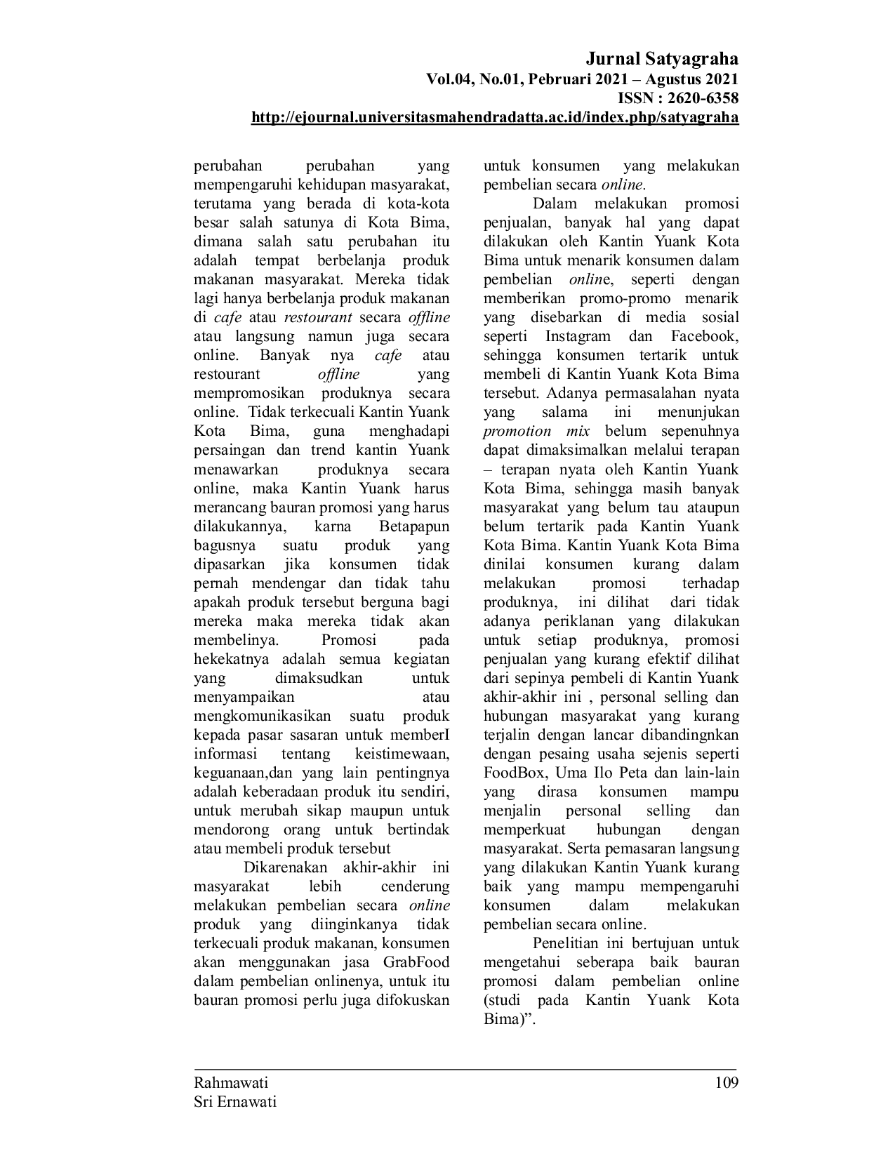 Jurnal Ilmiah SatyagrahaJurnal Ilmiah SatyagrahaPenelitian ini dilakukan berdasarkan permasalahan pada Kantin Yuank Kota Bima yang dinilai konsumen kurang dalam melakukan promosi terhadap produknya sehingga konsumen kurang berminat dalam melakukan pembelian online pada Kantin Yuank Kota Bima. Penelitian ini bertujuan untuk mengetahui seberapa baik bauran promosi dalam pembelian online (studi pada Kantin Yuank Kota Bima). Jenis penelitian ini deskriptif. Populasi yang digunakan dalam penelitian ini yaitu seluruh konsumen yang pernah membeli secara online produk dari Kantin Yuank Kota Bima yang jumlahnya tidak diketahui secara pasti (Unknowns Population). Jumlah sampel untuk penelitian deskriptif sebanyak 100 orang responden dengan menggunakan teknik pengambilan sampel purposive sampling. Teknik pengumpulan data yang digunakan yaitu: observasi, kuesioner dan studi pustaka. Teknik analisa data yang digunakan dalam penelitian ini adalah: uji validitas, uji reliabilitas dan uji t (t-test one sampel). Hasil dalam penelitian ini menunjukan bahwa bauran promosi dalam pembelian online (studi pada Kantin Yuank Kota Bima) lebih dari 70% dari yang diharapkan (baik).