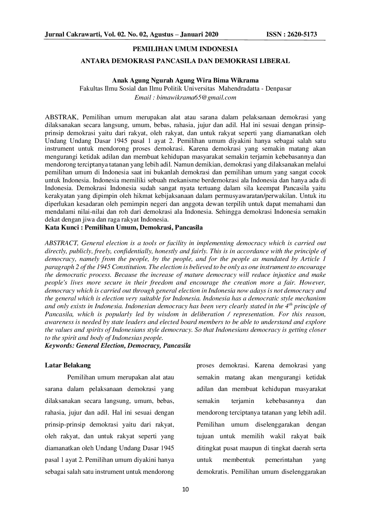 Jurnal Ilmiah CakrawartiJurnal Ilmiah CakrawartiPemilihan umum merupakan alat atau sarana dalam pelaksanaan demokrasi yang dilaksanakan secara langsung, umum, bebas, rahasia, jujur, dan adil. Hal ini sesuai dengan prinsip-prinsip demokrasi yaitu dari rakyat, oleh rakyat, dan untuk rakyat seperti yang diamanatkan oleh Undang-Undang Dasar 1945 pasal 1 ayat 2. Pemilihan umum diyakini hanya sebagai salah satu instrument untuk mendorong proses demokrasi. Karena demokrasi yang semakin matang akan mengurangi ketidakadilan dan membuat kehidupan masyarakat semakin terjamin kebebasannya dan mendorong terciptanya tatanan yang lebih adil. Namun demikian, demokrasi yang dilaksanakan melalui pemilihan umum di Indonesia saat ini bukanlah demokrasi dan pemilihan umum yang sangat cocok untuk Indonesia. Indonesia memiliki sebuah mekanisme berdemokrasi ala Indonesia dan hanya ada di Indonesia. Demokrasi Indonesia sudah sangat nyata tertuang dalam sila keempat Pancasila yaitu kerakyatan yang dipimpin oleh hikmat kebijaksanaan dalam permusyawaratan/perwakilan. Untuk itu diperlukan kesadaran oleh pemimpin negeri dan anggota dewan terpilih untuk dapat memahami dan mendalami nilai-nilai dan roh dari demokrasi ala Indonesia. Sehingga demokrasi Indonesia semakin dekat dengan jiwa dan raga rakyat Indonesia.