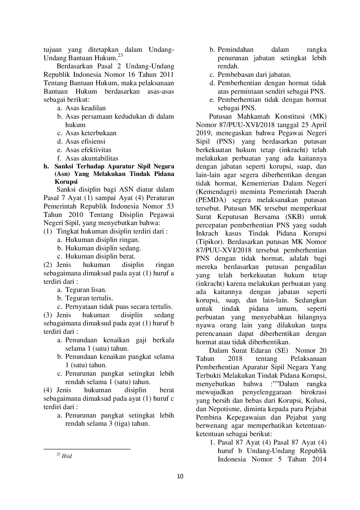 Penelitian ini menyimpulkan bahwa pengaturan pemberian bantuan hukum terhadap ASN pelaku tindak pidana korupsi telah diatur dalam berbagai peraturan perundang-undangan.Sanksi terhadap ASN yang melakukan tindak pidana korupsi diatur dalam peraturan pemerintah dan undang-undang, namun belum sepenuhnya memenuhi cita-cita hukum karena adanya multitafsir dalam beberapa pasal.Pemberian sanksi terhadap ASN pelaku korupsi harus mewakili keadilan dan sesuai dengan sumpah ASN untuk taat dan setia kepada Pancasila dan UUD 1945.