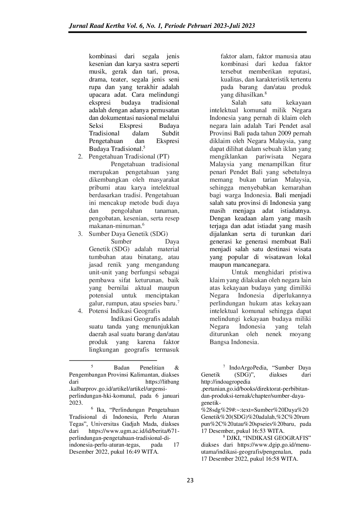 Jurnal Ilmiah Raad KerthaJurnal Ilmiah Raad KerthaKekayaan Intelektual adalah hak eksklusif yang diberikan oleh negara kepada kreator, inventor, desainer, dan pencipta berkaitan dengan kreasi atau karya intelektual mereka. Adapun kekayaan intelektual komunal adalah kekayaan intelektual yang dimiliki oleh masyarakat umum bersifat komunal. Kekayaan Intelektual Komunal yang selanjutnya disingkat KIK adalah kekayaan intelektual yang berupa Ekspresi Budaya Tradisional (EBT), Pengetahuan Tradisonal (PT), Sumber Daya Genetik (SDG) dan Potensi Indikasi Geografis. Beberapa kekayaan intelektual milik Negara Indonesia sering diakui oleh negara lain, terutama yang menyangkut warisan budaya seperti tari-tarian tradisional. Salah satu kekayaan intelektual komunal milik Negara Indonesia yang pernah di klaim oleh negara lain adalah Tari Pendet asal Provinsi Bali pada tahun 2009 pernah diklaim oleh Negara Malaysia. Maka dari itu untuk mempertahankan hak kekayaan intelektual komunal milik Indonesia dibutuhkan perlindungan hukum dan upaya pemerintah dalam mencegah terjadinya kembali klaim atas kekayaan intelektual kominal milik Negara Indonsesia.