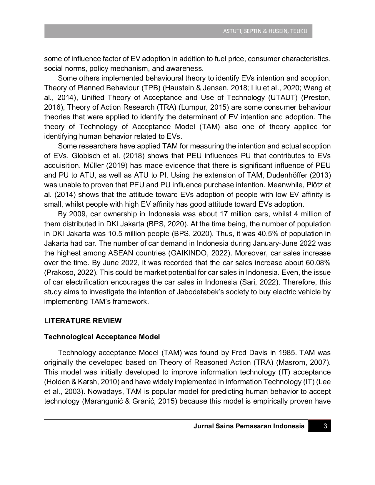 Jurnal Sains Pemasaran Indonesia (Indonesian Journal of Marketing Science)Jurnal Sains Pemasaran Indonesia (Indonesian Journal of Marketing Science)Penjualan mobil meningkat seiring dengan pertumbuhan populasi. Sayangnya, transportasi modern memiliki dampak negatif terhadap lingkungan. Hal ini mendorong para pemimpin dunia untuk mendorong produsen kendaraan mengembangkan kendaraan yang lebih ramah lingkungan seperti mobil listrik yang menghasilkan polusi lebih rendah. Jakarta merupakan salah satu pasar utama mobil di Indonesia dan dapat menjadi target utama pengembangan mobil listrik. Namun, mobil listrik di Indonesia masih tergolong kendaraan yang baru dikembangkan dan pasarnya sangat terbatas. Penelitian ini mengkaji niat masyarakat muda di Jakarta, Bogor, Depok, Tangerang, dan Bekasi untuk membeli mobil listrik. Model Penerimaan Teknologi (Technology Acceptance Model/TAM) digunakan dalam penelitian ini. Hasil menunjukkan bahwa semua variabel TAM memberikan kontribusi signifikan terhadap niat pembelian. Pengaruh persepsi kemudahan penggunaan terhadap persepsi kegunaan signifikan, yang selanjutnya memengaruhi sikap terhadap penggunaan kendaraan listrik dan berkontribusi terhadap niat pembelian kendaraan listrik.