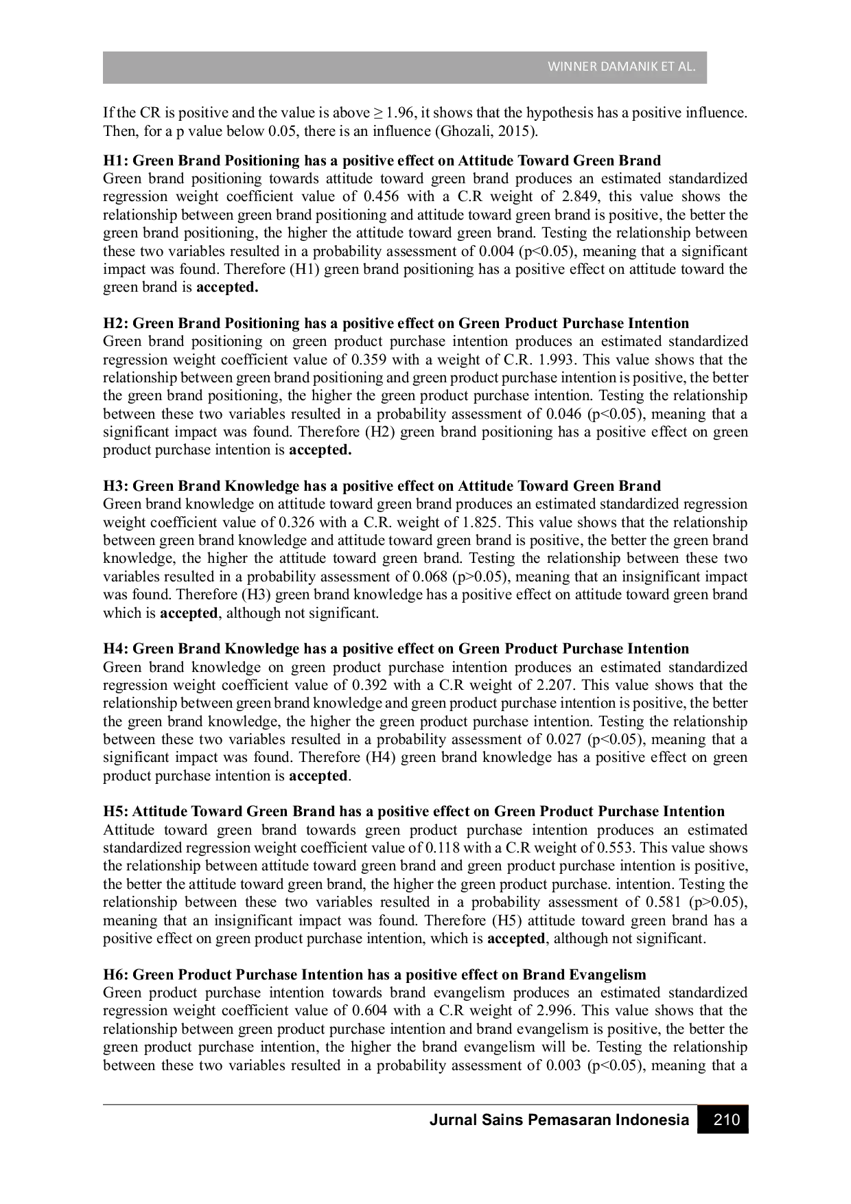 The research concludes that green brand positioning significantly influences both attitude toward green brands and intention to purchase green products.While green brand knowledge shows an insignificant effect on attitude, it positively impacts purchase intention.Furthermore, intention to purchase green products significantly motivates consumers to become brand evangelists.These findings highlight the importance of strengthening green brand positioning and knowledge to foster positive consumer attitudes and ultimately, brand advocacy.