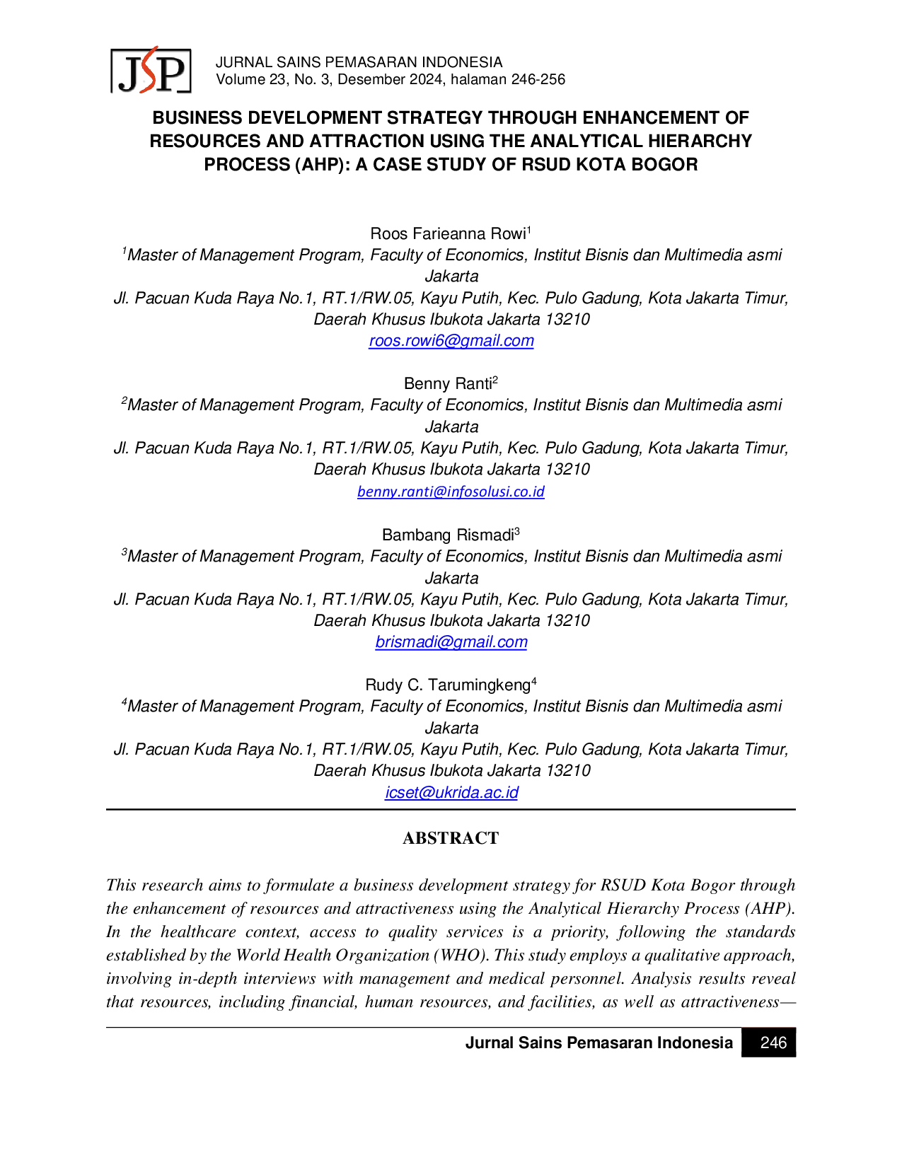 Jurnal Sains Pemasaran Indonesia (Indonesian Journal of Marketing Science)Jurnal Sains Pemasaran Indonesia (Indonesian Journal of Marketing Science)Penelitian ini bertujuan untuk merumuskan strategi pengembangan bisnis bagi RSUD Kota Bogor melalui peningkatan sumber daya dan daya tarik menggunakan Proses Hierarki Analitis (AHP). Dalam konteks layanan kesehatan, akses terhadap layanan berkualitas merupakan prioritas, sesuai dengan standar yang ditetapkan oleh Organisasi Kesehatan Dunia (WHO). Studi ini menggunakan pendekatan kualitatif, melibatkan wawancara mendalam dengan personel manajemen dan medis. Hasil analisis mengungkapkan bahwa sumber daya, termasuk keuangan, sumber daya manusia, dan fasilitas, serta daya tarik—yang meliputi kepuasan pelanggan dan faktor pasar—secara signifikan memengaruhi pengembangan bisnis rumah sakit. Tiga strategi utama diusulkan: pengembangan rumah sakit sebagai institusi rujukan terkemuka, pembentukan rumah sakit sebagai fasilitas pengajaran, dan implementasi layanan digital. Temuan ini diharapkan dapat memberikan panduan bagi manajemen RSUD Kota Bogor dalam mengembangkan strategi yang efektif dan berkelanjutan.