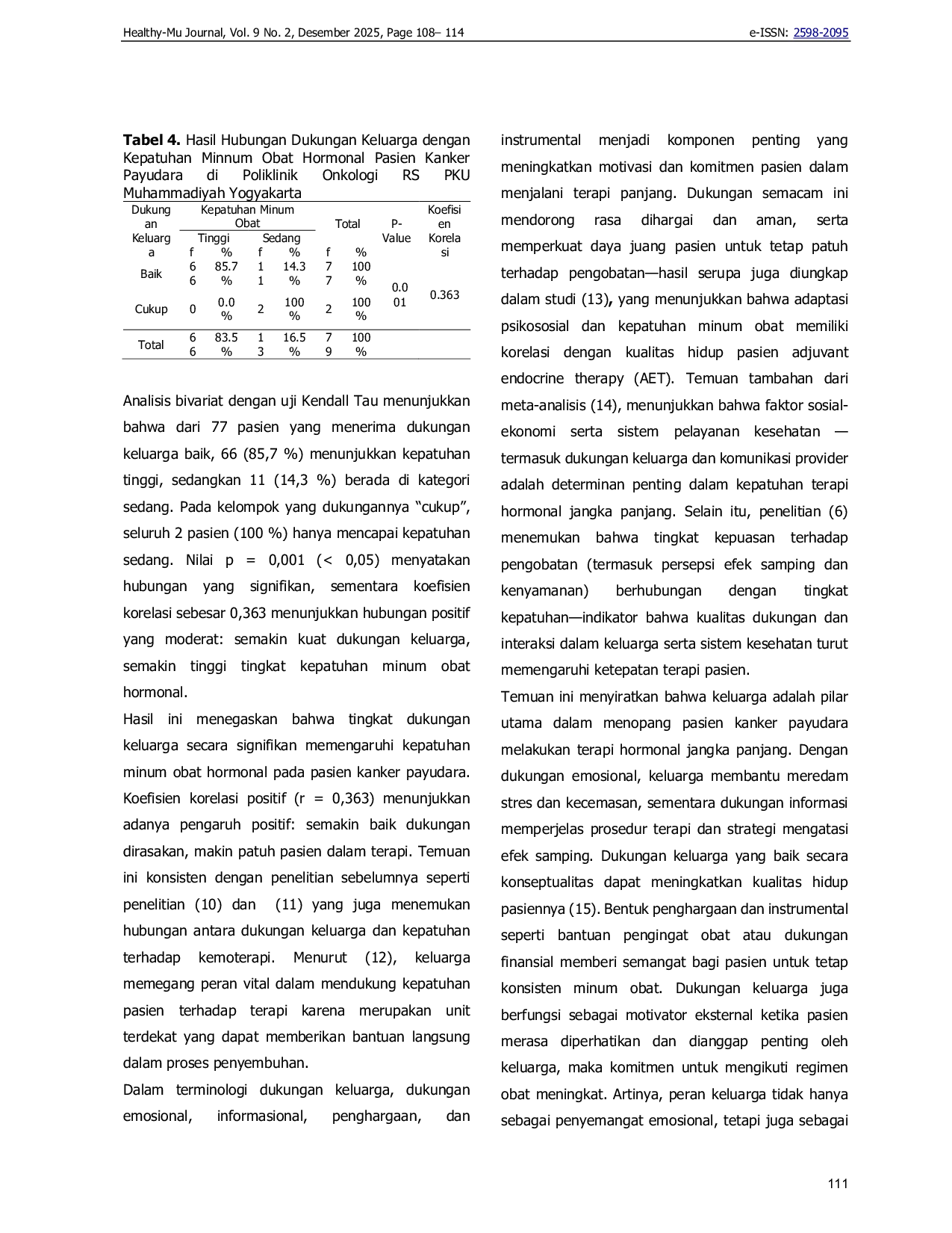Healthy-Mu JournalHealthy-Mu JournalPasien dengan kanker payudara yang positif reseptor hormon diharuskan menjalani terapi hormon selama lima hingga sepuluh tahun, dan ketidakpatuhan terhadap pengobatan meningkatkan risiko kekambuhan dan kematian. Dukungan keluarga dianggap memainkan peran penting dalam meningkatkan kepatuhan terhadap terapi hormonal. Penelitian ini bertujuan untuk menentukan hubungan antara dukungan keluarga dan kepatuhan terhadap pengobatan hormonal pada pasien kanker payudara di Poliklinik Onkologi PKU Muhammadiyah Hospital, Yogyakarta. Penelitian kuantitatif ini menggunakan desain korelasi deskriptif dengan pendekatan cross-sectional. Populasi penelitian terdiri dari semua pasien kanker payudara yang menerima pengobatan hormonal di poliklinik, dan sampel diambil menggunakan teknik total sampling dengan 79 responden. Data dikumpulkan menggunakan kuesioner dukungan keluarga dan kepatuhan minum obat, dan analisis dilakukan menggunakan uji korelasi Kendall Tau. Hasil menunjukkan hubungan yang signifikan antara dukungan keluarga dan kepatuhan terhadap pengobatan hormonal, dengan nilai signifikansi 0,001 dan koefisien korelasi 0,363. Temuan ini menunjukkan bahwa semakin tinggi dukungan yang diberikan oleh keluarga, semakin tinggi tingkat kepatuhan pasien kanker payudara dalam mengonsumsi pengobatan hormonal. Kesimpulan penelitian ini adalah dukungan keluarga memainkan peran krusial dalam kepatuhan pengobatan, dan memperkuat keterlibatan keluarga diharapkan dapat meningkatkan kepatuhan pada pasien kanker payudara yang menjalani terapi hormonal.