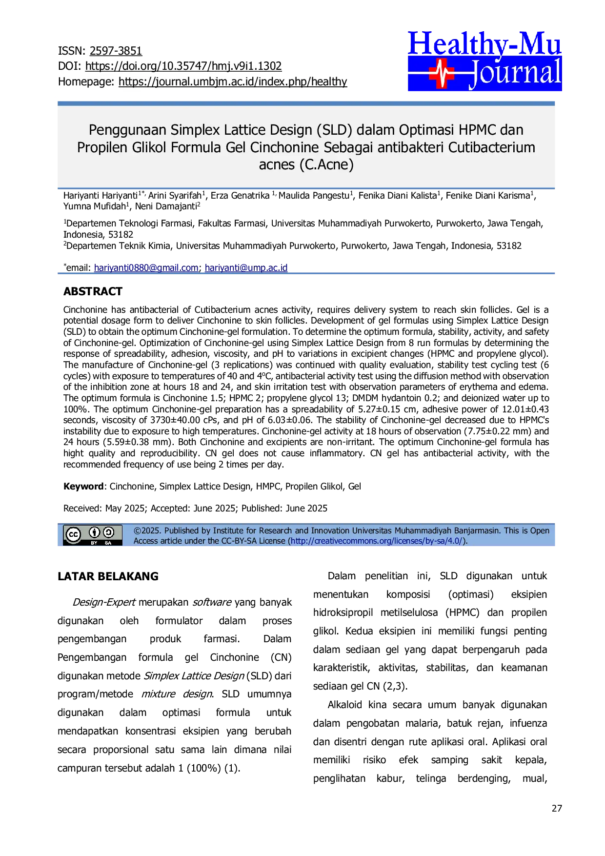 Healthy-Mu JournalHealthy-Mu JournalCinchonine memiliki aktivitas antibakteri terhadap Cutibacterium acnes, sehingga memerlukan sistem penghantaran untuk mencapai folikel kulit. Gel merupakan bentuk sediaan potensial untuk menghantarkan Cinchonine ke folikel kulit. Penelitian ini bertujuan untuk mengembangkan formula gel menggunakan Simplex Lattice Design (SLD) untuk memperoleh formula Cinchonine-gel yang optimal, serta menentukan stabilitas, aktivitas, dan keamanan Cinchonine-gel. Optimasi Cinchonine-gel menggunakan Simplex Lattice Design dari 8 formula dengan menentukan respons daya sebar, daya lekat, viskositas, dan pH terhadap variasi perubahan eksipien (HPMC dan propilen glikol). Pembuatan Cinchonine-gel (3 replikasi) dilanjutkan dengan evaluasi kualitas, uji stabilitas siklus (6 siklus) dengan paparan suhu 40 dan 4°C, uji aktivitas antibakteri menggunakan metode difusi dengan pengamatan zona inhibisi pada jam ke-18 dan 24, serta uji iritasi kulit dengan parameter pengamatan eritema dan edema. Formula optimal adalah Cinchonine 1,5; HPMC 2; propilen glikol 13; DMDM hydantoin 0,2; dan air deionisasi hingga 100%. Preparasi Cinchonine-gel optimal memiliki daya sebar 5,27±0,15 cm, daya lekat 12,01±0,43 detik, viskositas 3730±40,00 cPs, dan pH 6,03±0,06. Stabilitas Cinchonine-gel menurun karena ketidakstabilan HPMC akibat paparan suhu tinggi. Aktivitas Cinchonine-gel pada pengamatan jam ke-18 (7,75±0,22 mm) dan jam ke-24 (5,59±0,38 mm). Cinchonine dan eksipien tidak menyebabkan iritasi. Formula Cinchonine-gel optimal memiliki kualitas dan reproduksibilitas yang tinggi. Gel CN tidak menyebabkan peradangan. Gel CN memiliki aktivitas antibakteri, dengan frekuensi penggunaan yang disarankan adalah 2 kali sehari.